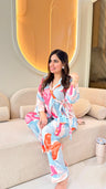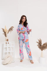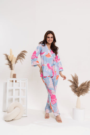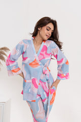 Easy, flattering, and effortlessly stylish — this wrap-style top with tie-up belt pairs perfectly with relaxed straight-leg pants. Designed for comfort and movement, this set blends modern print with functional details for everyday ease.