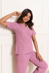 Stay cozy without compromising on style. This ribbed PJ set features a V-neck top with short sleeves and a front pocket, paired with easy mid-rise pajamas — designed for comfort, function, and a polished lounge look.
