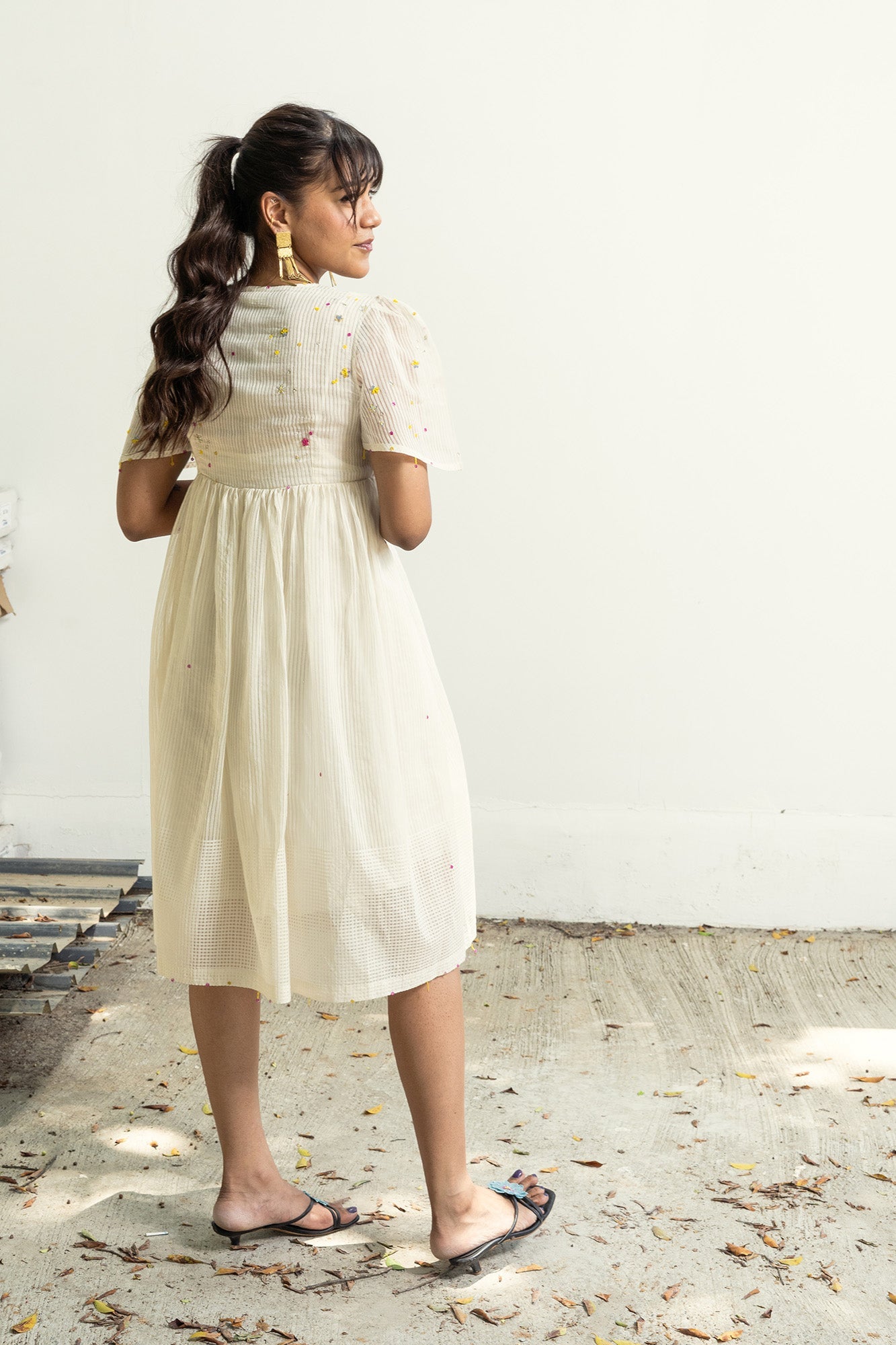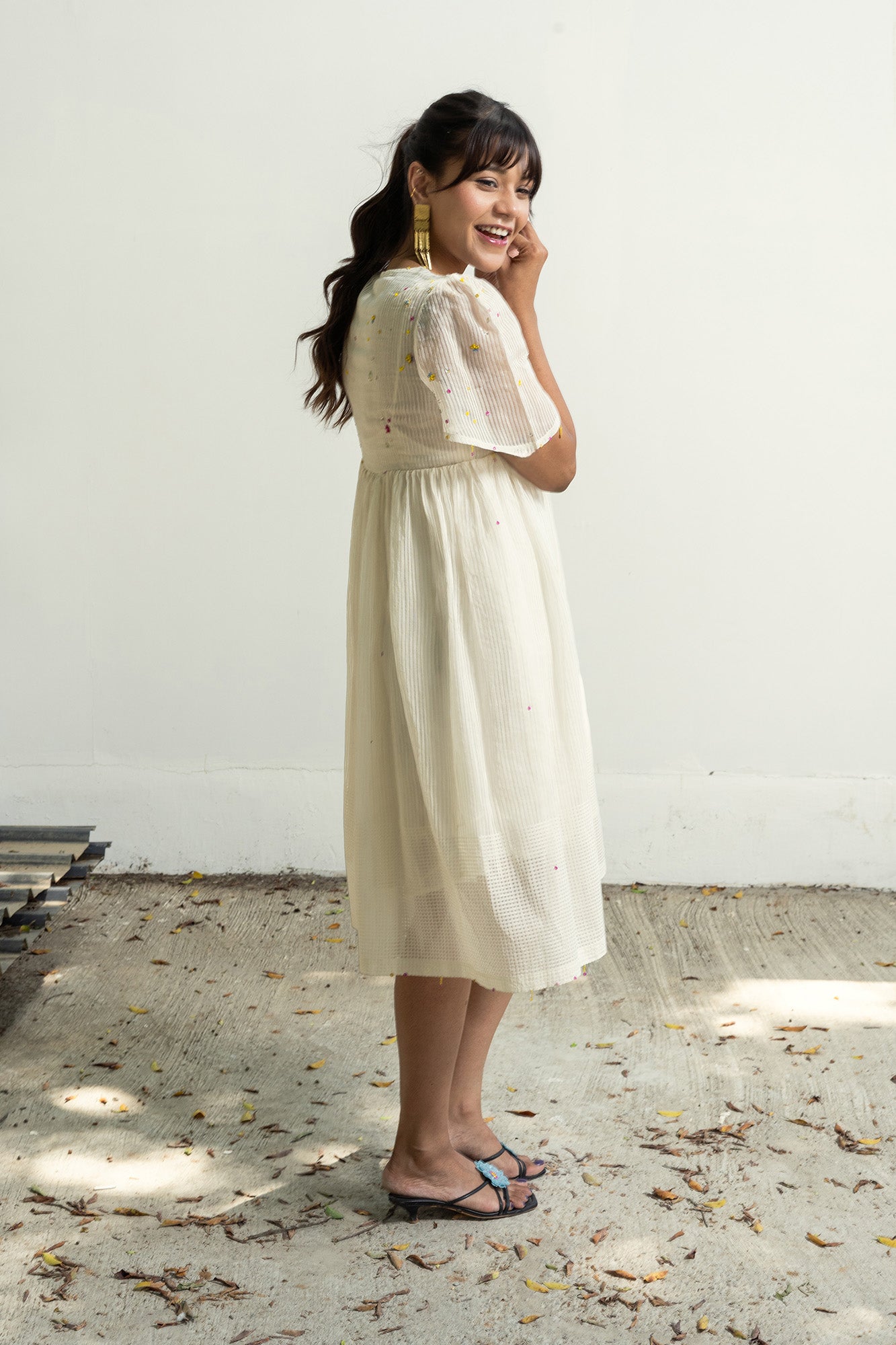 A dreamy blend of whimsy and charm, this white dress is detailed with playful 3D stars in pink and blue, shimmering sequins, and delicate silver dabka stars. The gathered waist adds shape while the relaxed fit keeps it effortless and breezy.