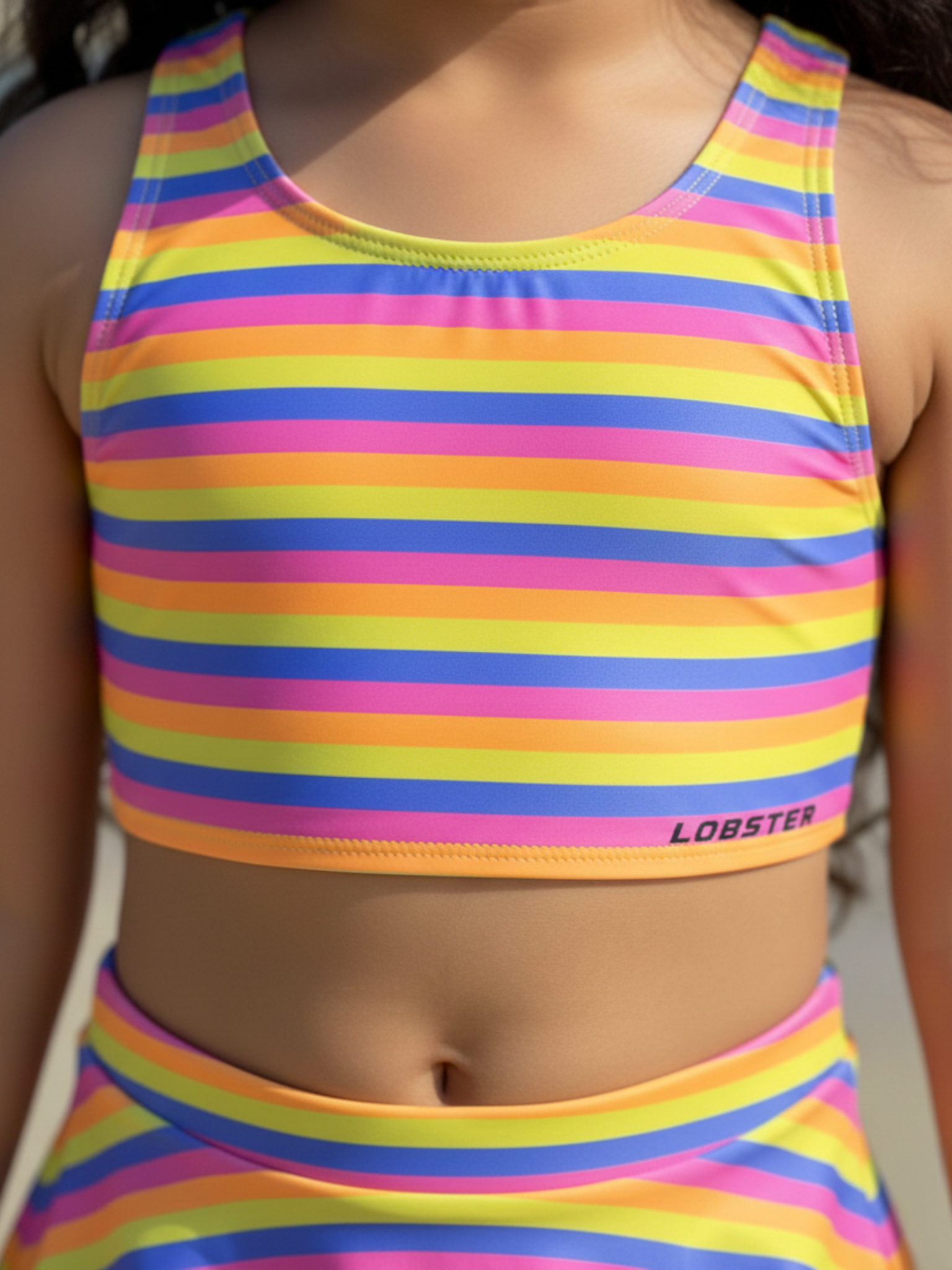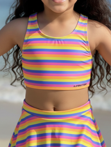 From the Brand Lobster, Curated by Covera. This vibrant striped tank and skirt swimset combines comfort with coverage, featuring a sporty crop top and coordinating skirted bottom for active young swimmers who love bold colors.