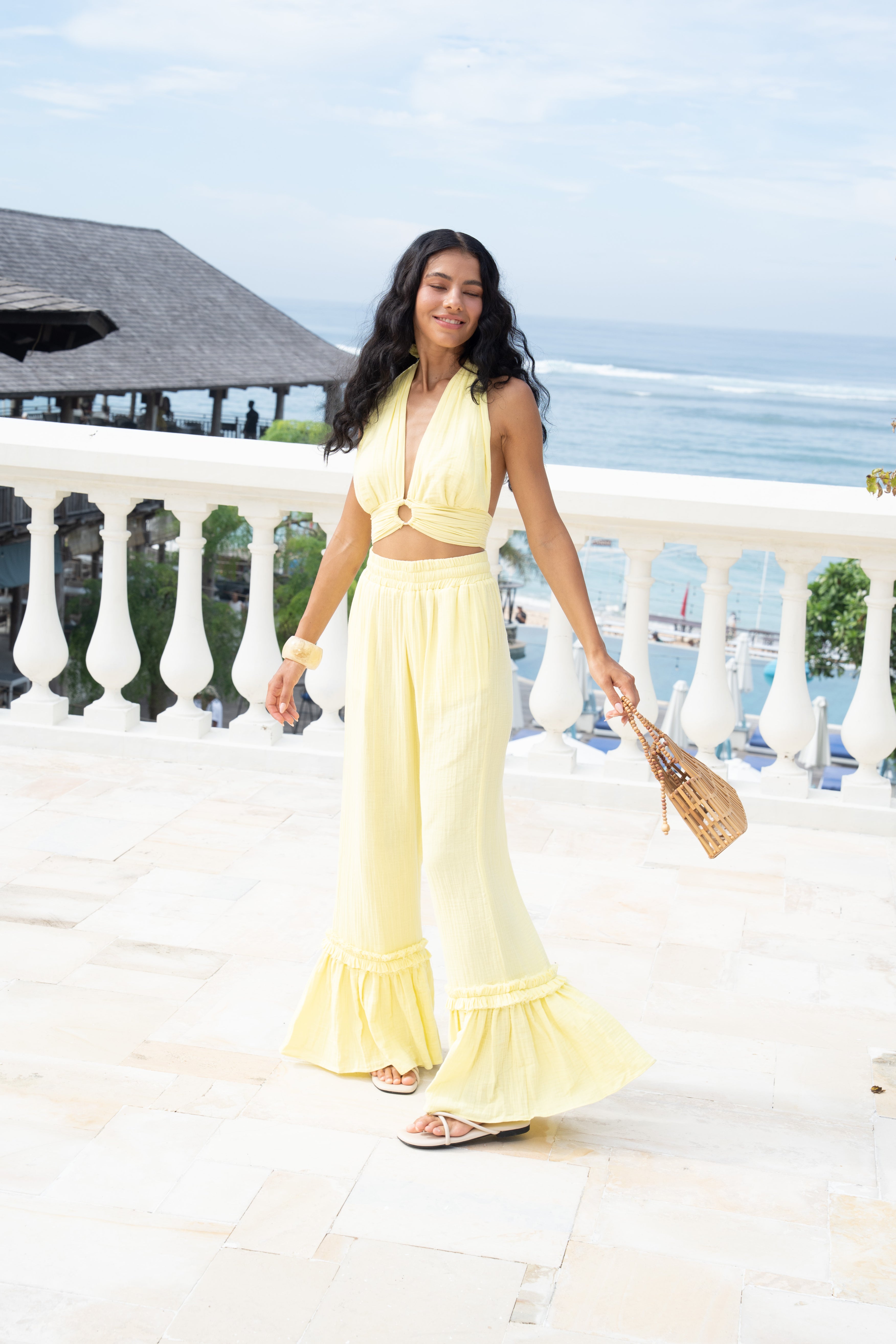 The flared silhouette is elevated with playful double tier ruffles at the hem, adding a soft and dramatic touch to your summer look. Perfect for beach strolls, vacations, and warm weather lounging, these pants bring effortless movement and relaxed charm to any outfit.