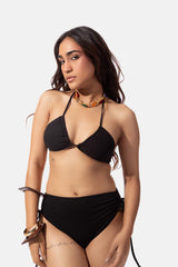 Bold, sculpted, and made to support — this plunge bikini set blends sleek structure with a flattering silhouette. The top features a deep V-neckline, thick elasticated underband, and adjustable straps with an N-hook closure for secure hold and all-day comfort, making it ideal for mid to heavy busts. Paired with high-waist bottoms finished with side gathers and full back coverage, the set cinches at the waist and smooths your curves for a confident, sculpted fit.