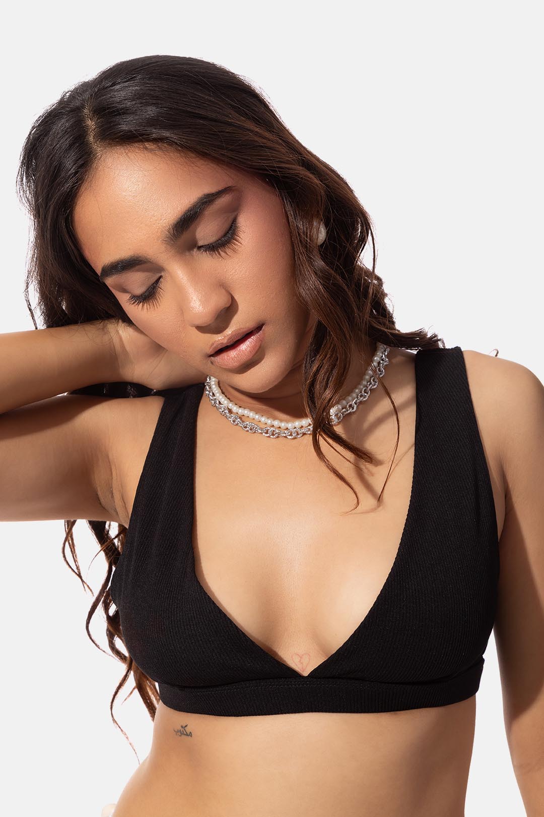 Chic, sleek, and built to support — this black textured plunge bikini top is a statement piece for fuller busts and bold beach looks. The deep V-neckline enhances your shape, while thick shoulder straps and an elasticated underband provide a secure, sculpted fit. Crafted in soft stretch fabric with an adjustable back band, it’s designed for all-day comfort and confident coverage.