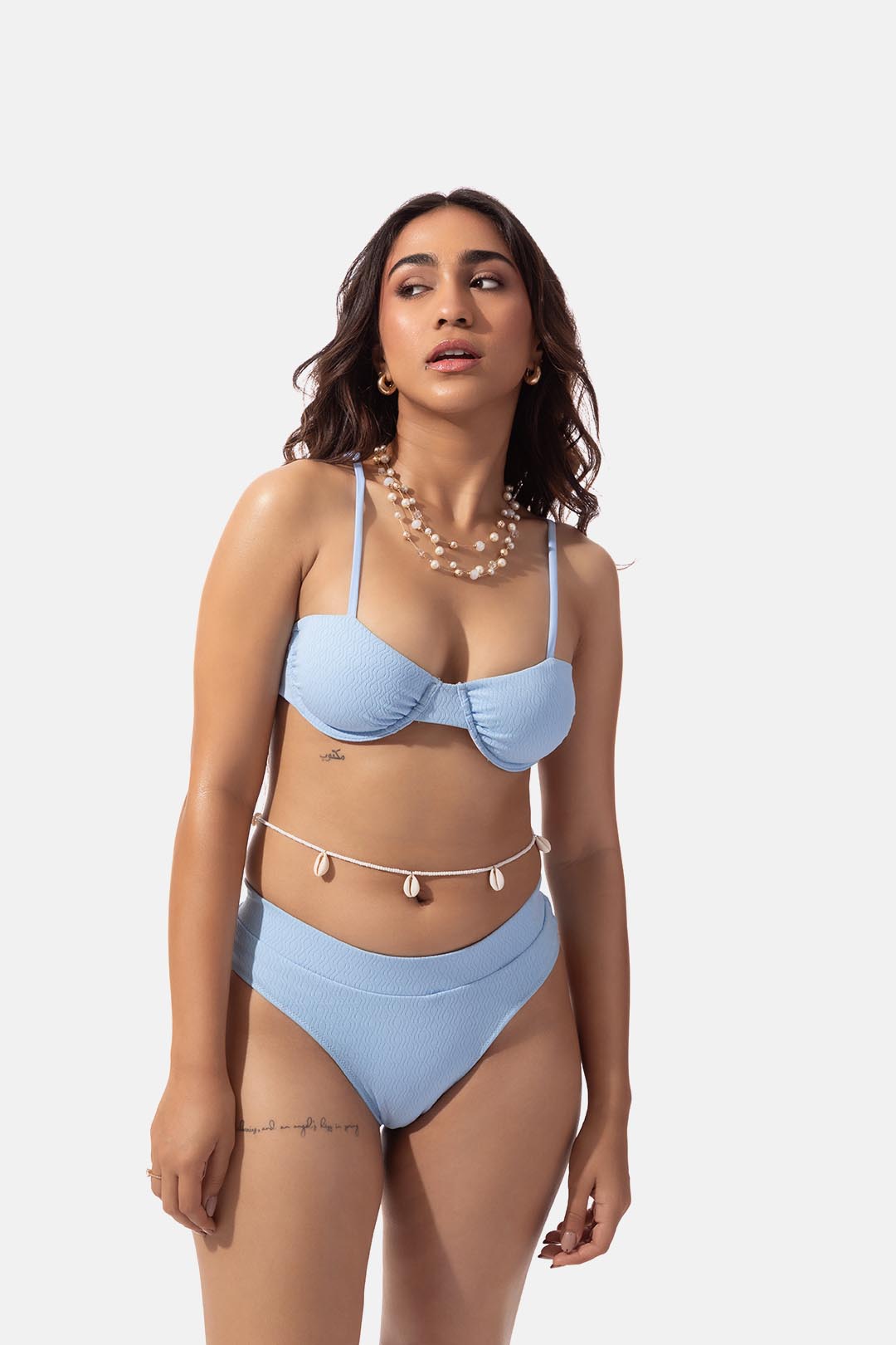 Strong on support, soft on feel — this ocean-inspired blue textured bikini top is built to flatter fuller busts. Designed with underwire construction and padded removable cups, it offers smooth shaping and lift. Adjustable shoulder straps and a tie-up back band give you control over the fit, while the ultra-soft stretch fabric keeps it comfortable from morning dips to sunset lounging.