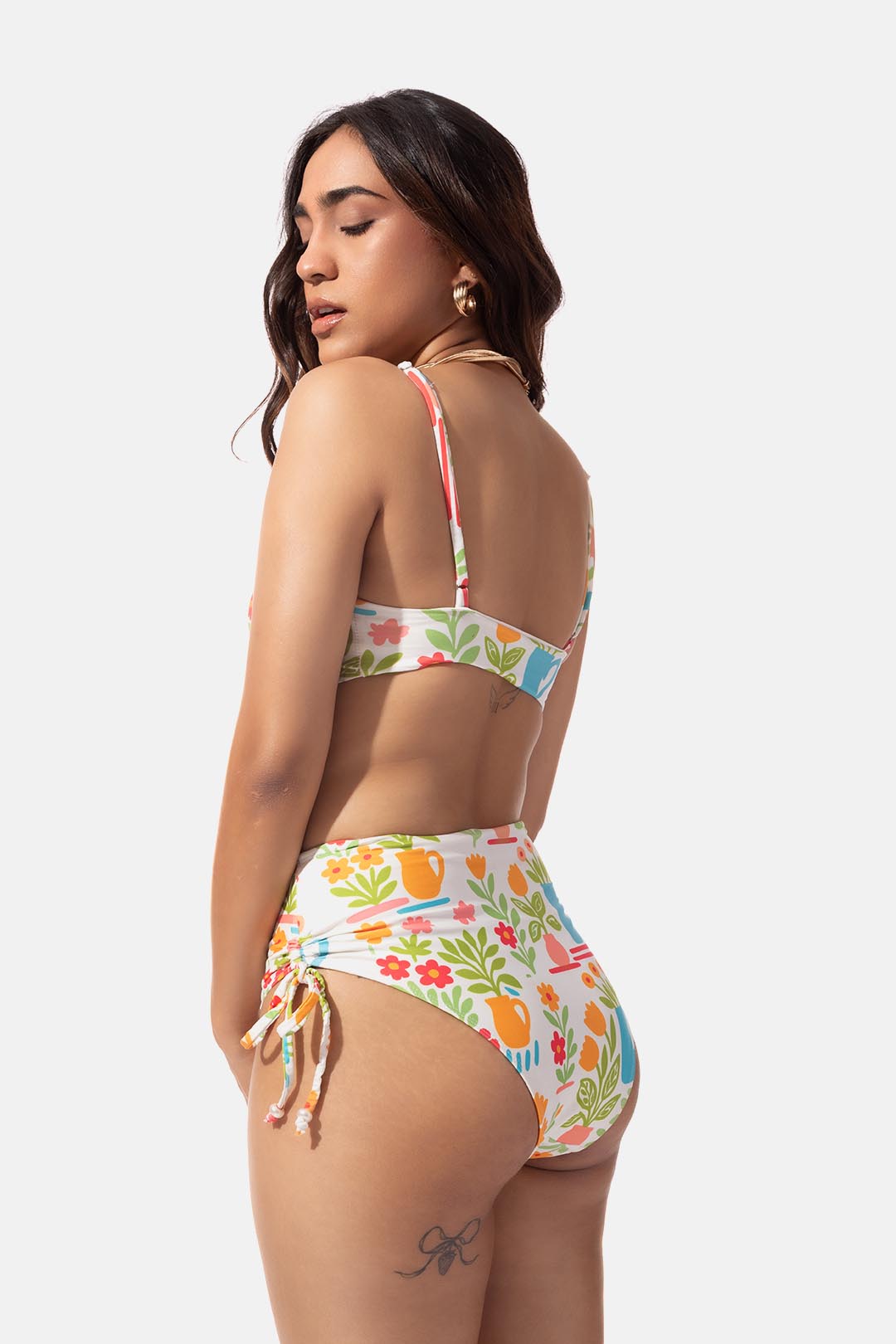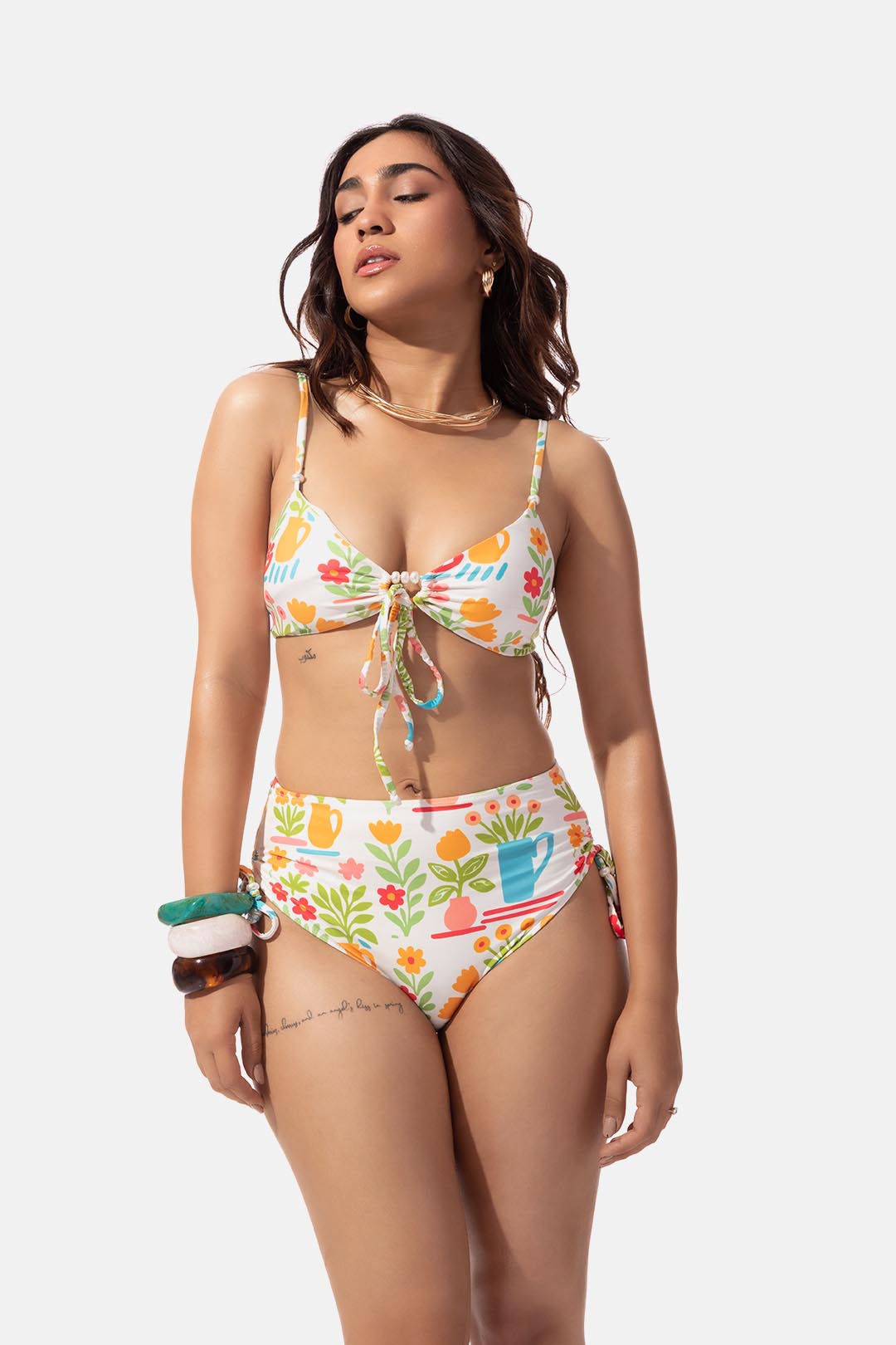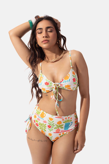 Bright, breezy, and effortlessly cute — this bikini top features a crisp white base with a lively multicolor floral print that instantly adds a playful pop to your swim look. Designed with a flattering front tie and supportive yet comfy fit, it’s your go-to for everything from lounging to poolside fun.