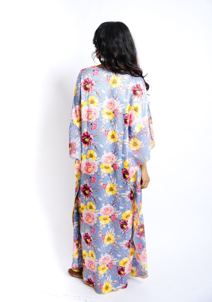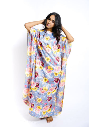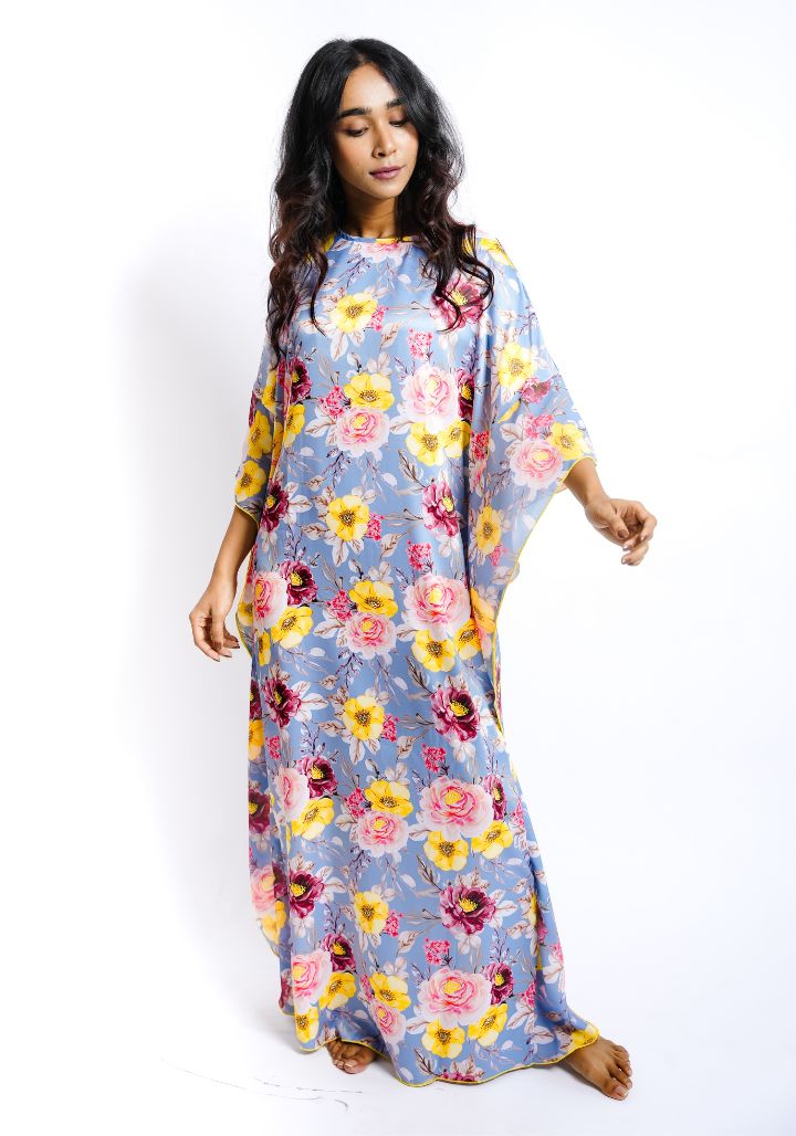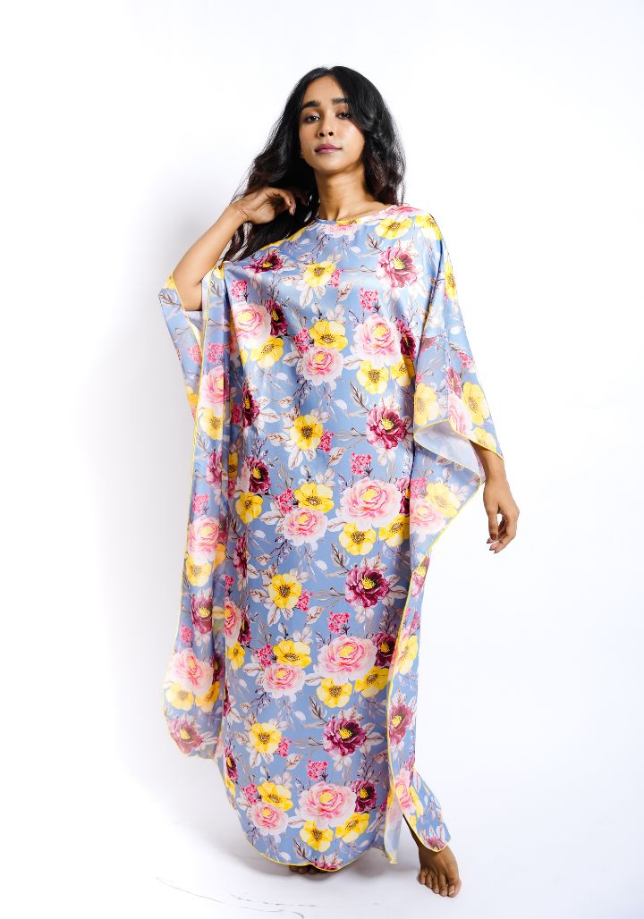 Combining soft luxury with relaxed charm, this floral printed satin kaftan nighty is designed for effortless lounging and restful nights. Its flowing silhouette and elegant print make it a standout addition to your nightwear wardrobe.