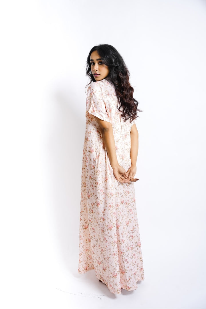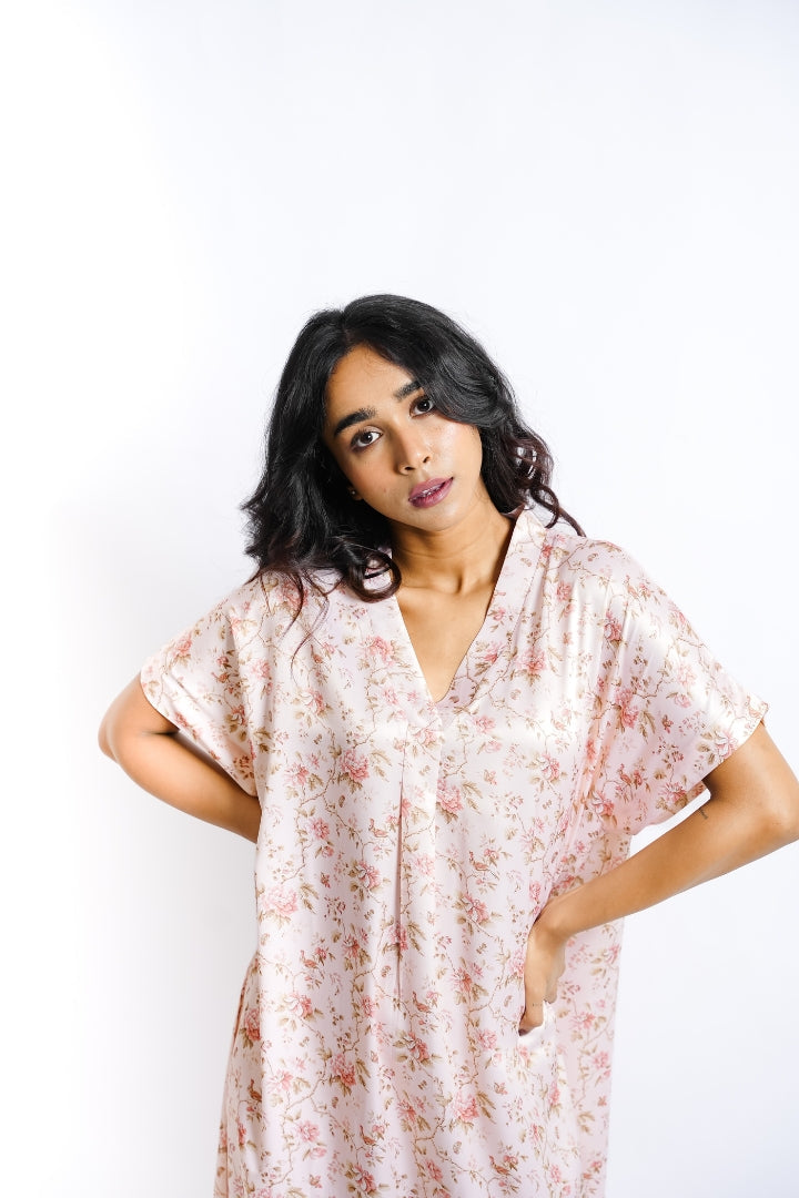 Soft, serene, and effortlessly romantic — the BlushPetal Satin Nighty is designed for slow mornings and moonlit evenings. With its delicate floral print and silky drape, it’s a timeless piece of loungewear.