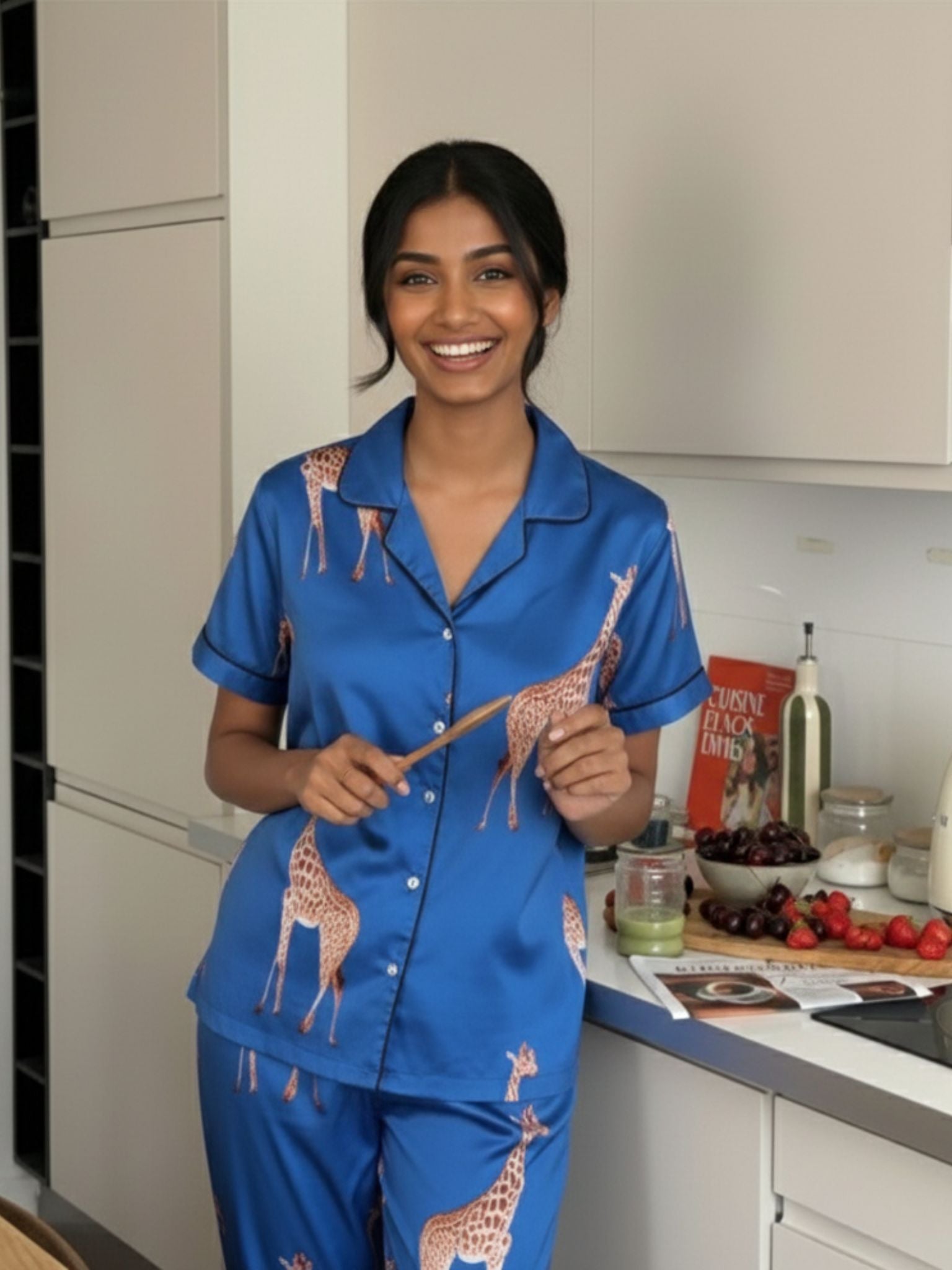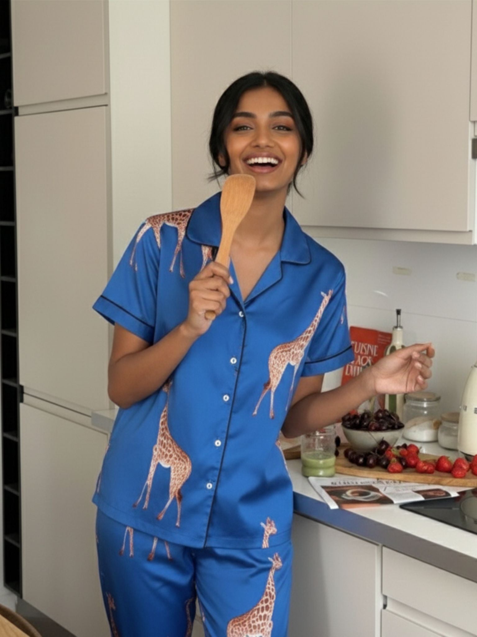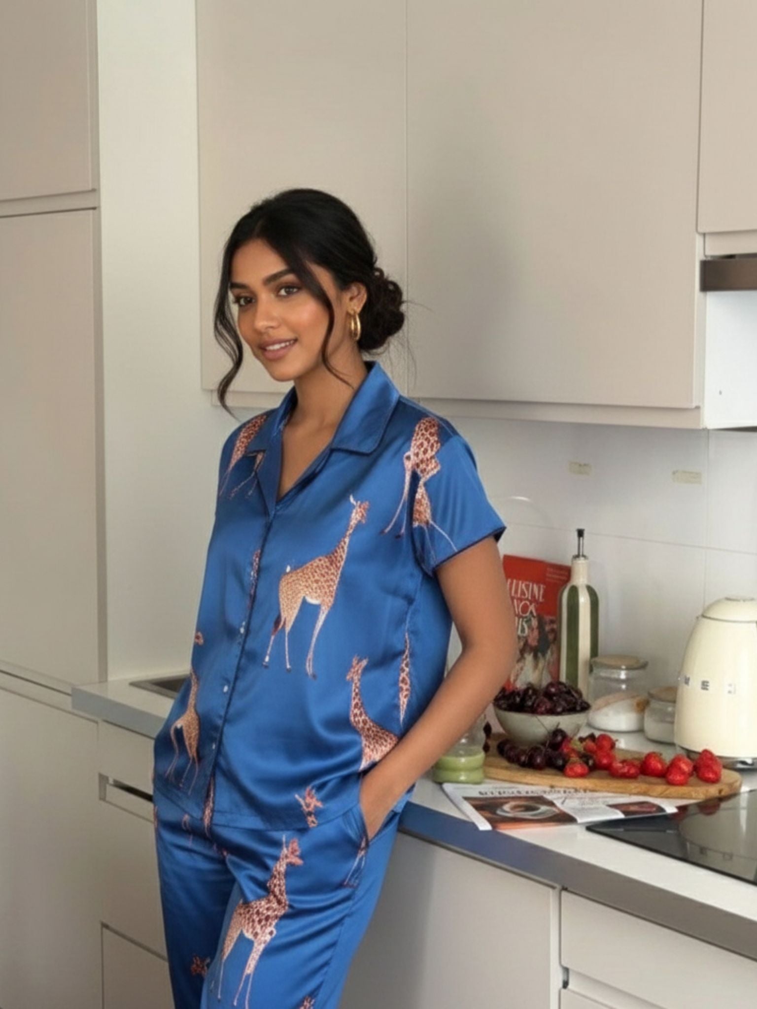 The Giraffe Print Blue Women’s Pajama Lounge Set is a refreshing addition to your casual wardrobe. Crafted from soft muslin fabric, this set offers a breezy, comfortable feel — perfect for relaxed lounging. The soothing blue hue paired with a playful giraffe print adds a fun and unique touch to your at-home style.
