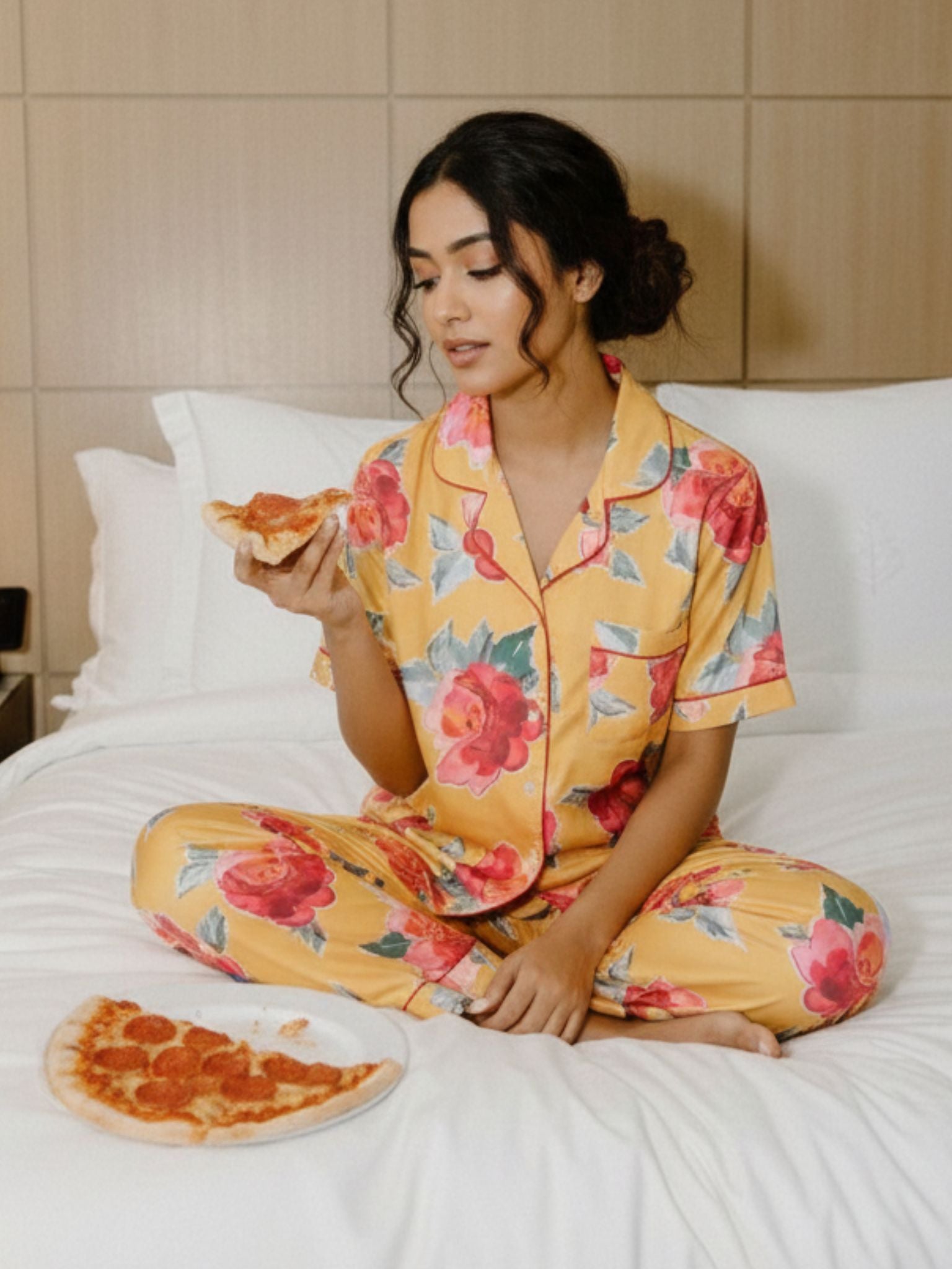 Introducing the Golden Bloom Yellow Lounge Floral Printed Pajama Set, a perfect blend of comfort and style. Featuring a vibrant yellow base adorned with bold, eye-catching floral prints, this set brings a refreshing touch to your loungewear collection. Crafted from soft muslin fabric, it offers a breathable and lightweight feel — ideal for relaxing at home.