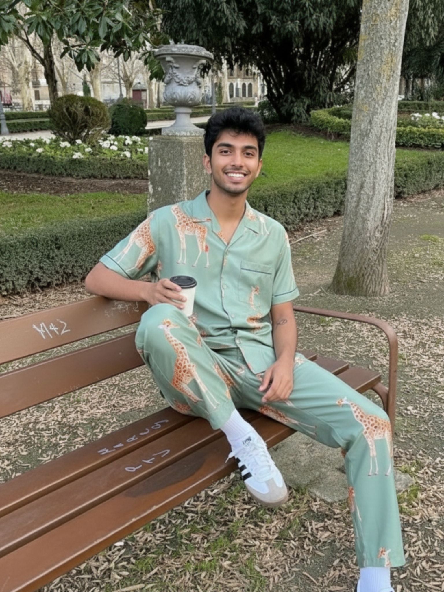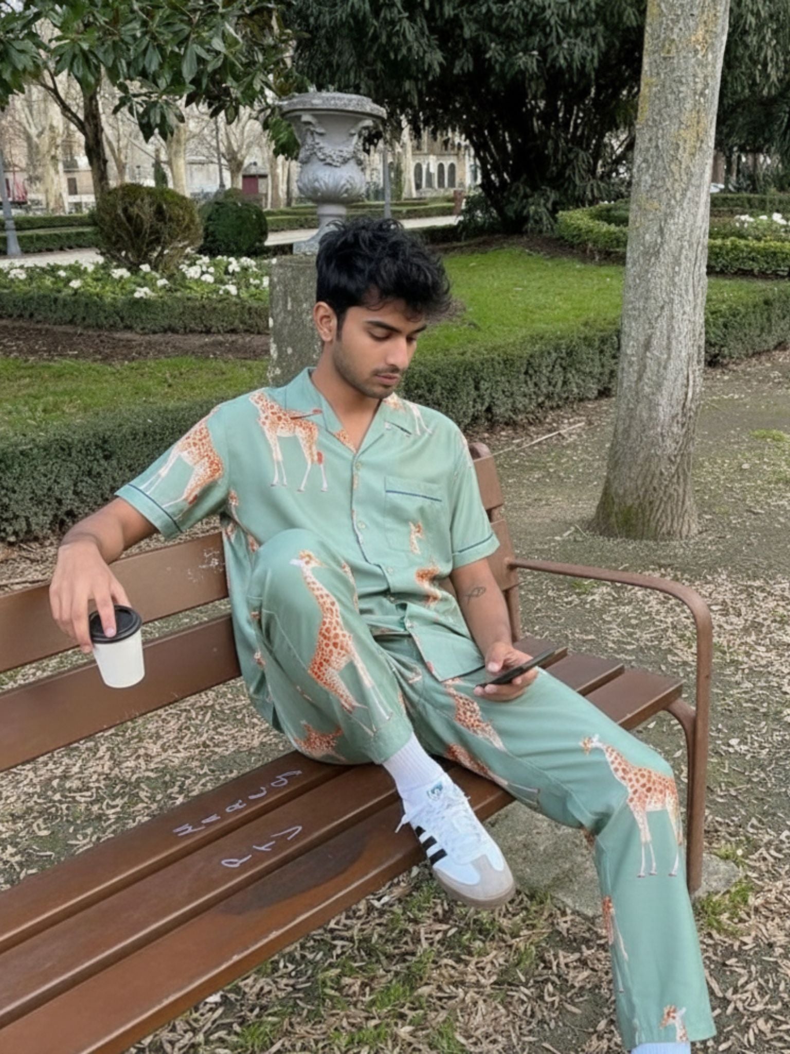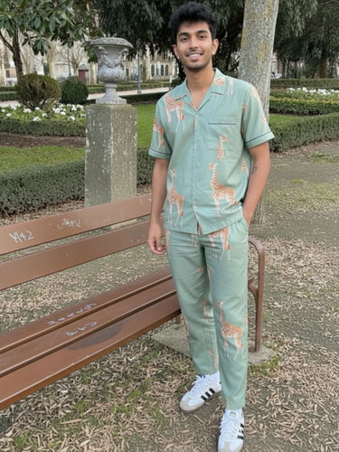 The Giraffe Print Green Men’s Pajama Lounge Set is a fun and stylish addition to your relaxed wardrobe. Crafted from soft muslin fabric, this set offers a cozy, breathable feel with a playful touch. The vibrant green fabric, adorned with a lively giraffe print, brings a bold and unique look — perfect for lounging in comfort.