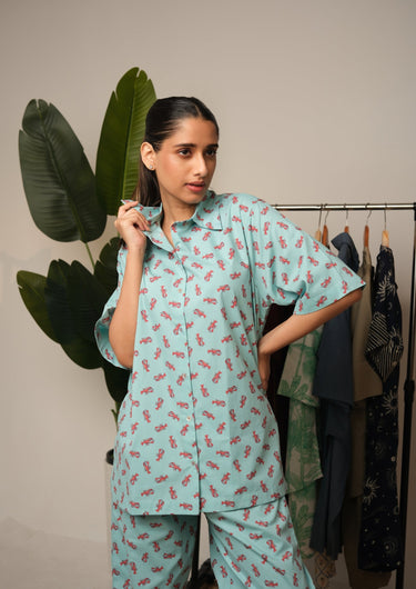 Make bedtime fun and effortlessly stylish with the Lobster Print Night Suit — a playful fusion of comfort and charm. Crafted from a soft, breathable cotton blend, this aqua blue set features a quirky all-over lobster print that adds a lively touch to your nightwear routine. Designed for relaxed comfort, it’s perfect for lounging, unwinding, or catching up on restful sleep.