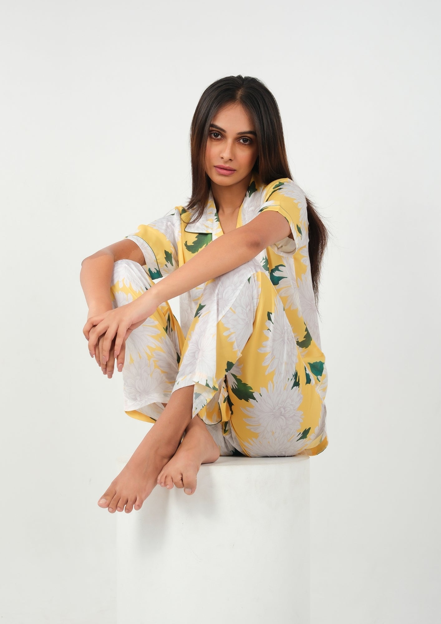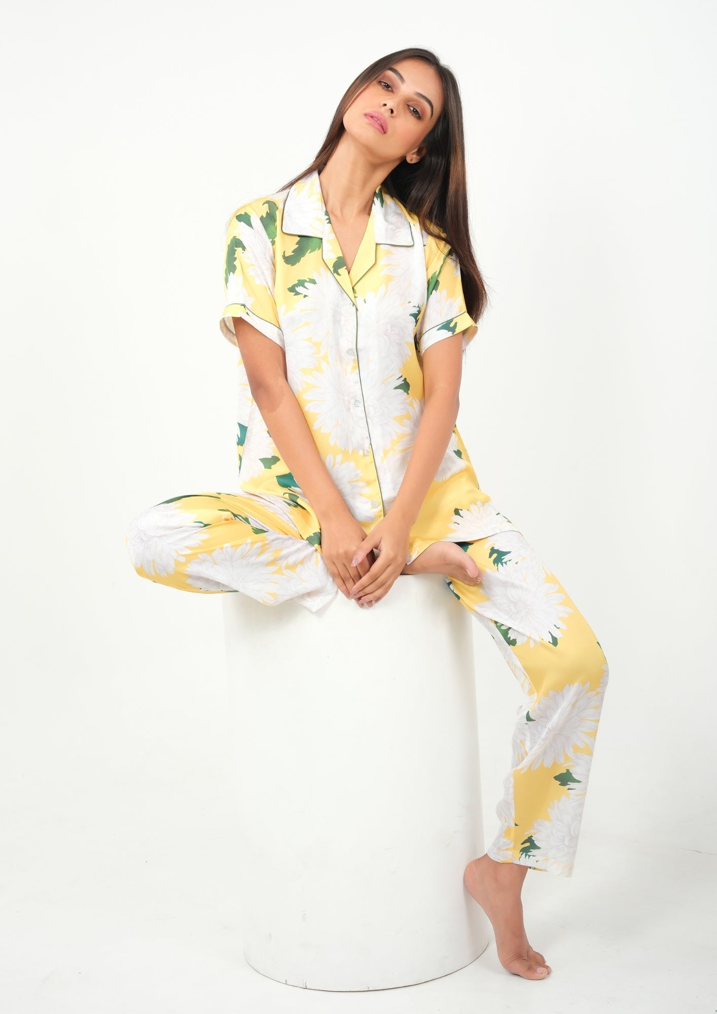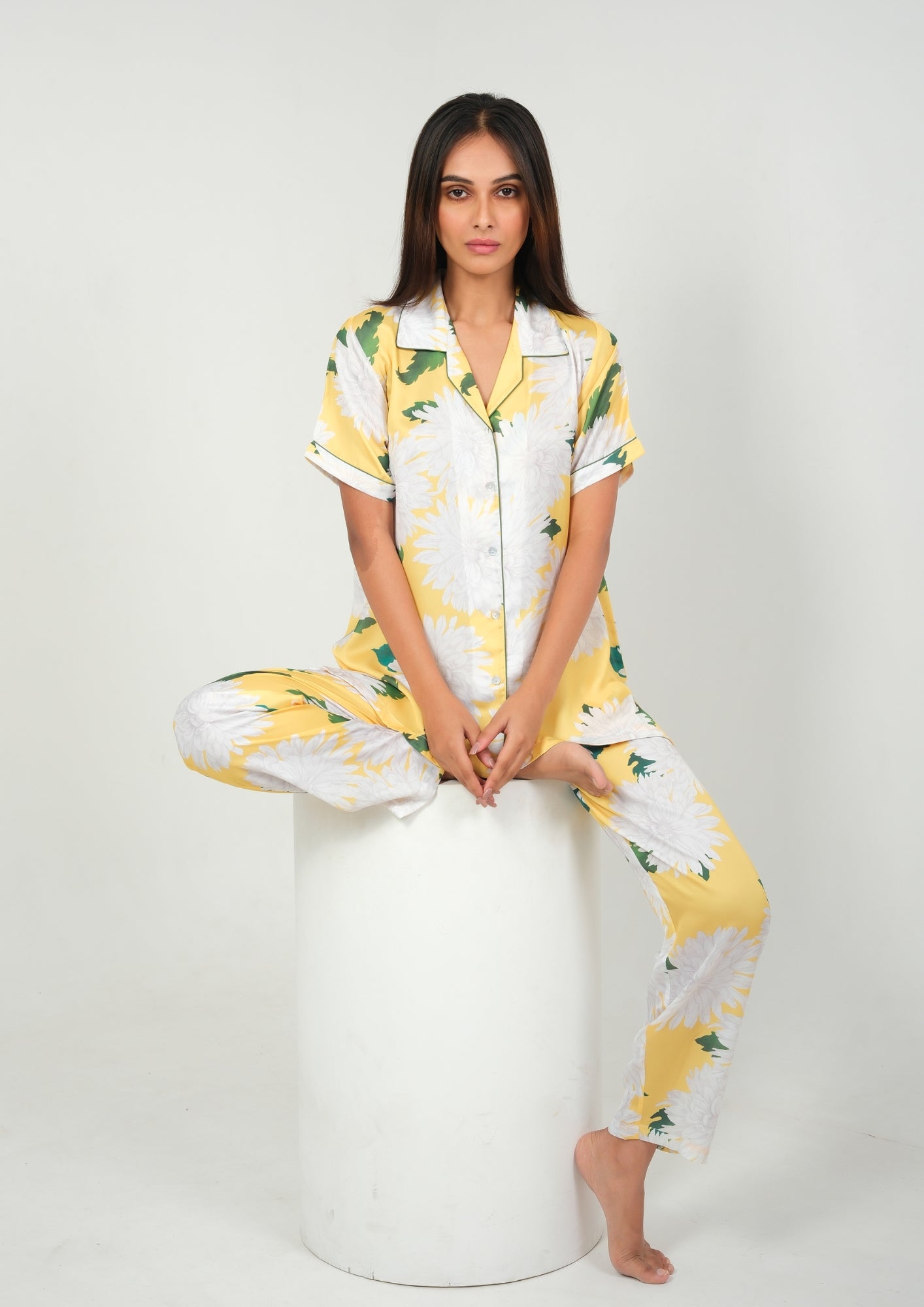 Sunlit Bloom Yellow Floral Satin Night Suit