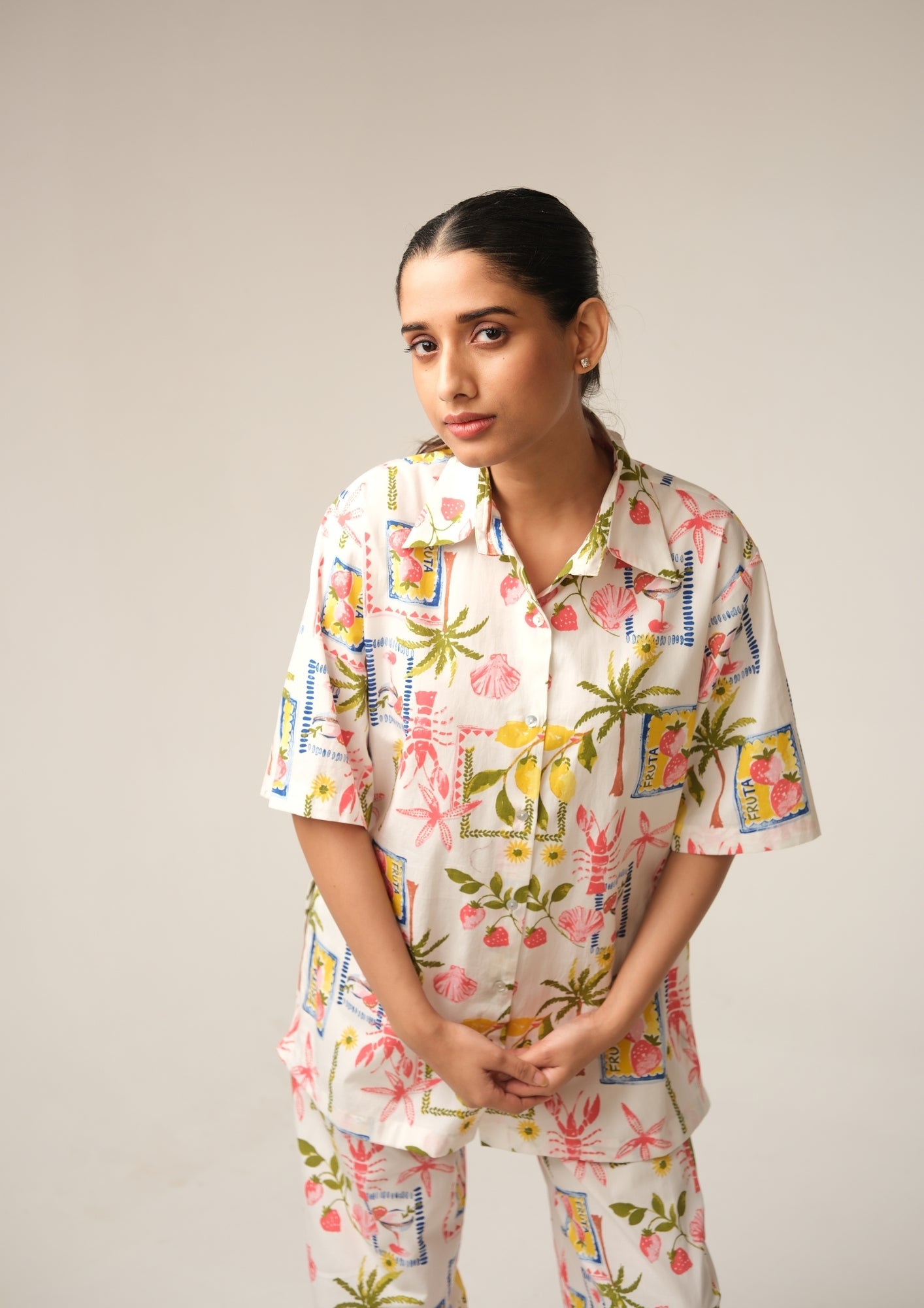 Step into comfort with a burst of color in the Tropical Bliss Printed Night Suit — a vibrant blend of playful style and relaxed elegance. Featuring tropical and floral-inspired prints, this co-ord set captures the essence of vacation ease while keeping you cozy and stylish at home.