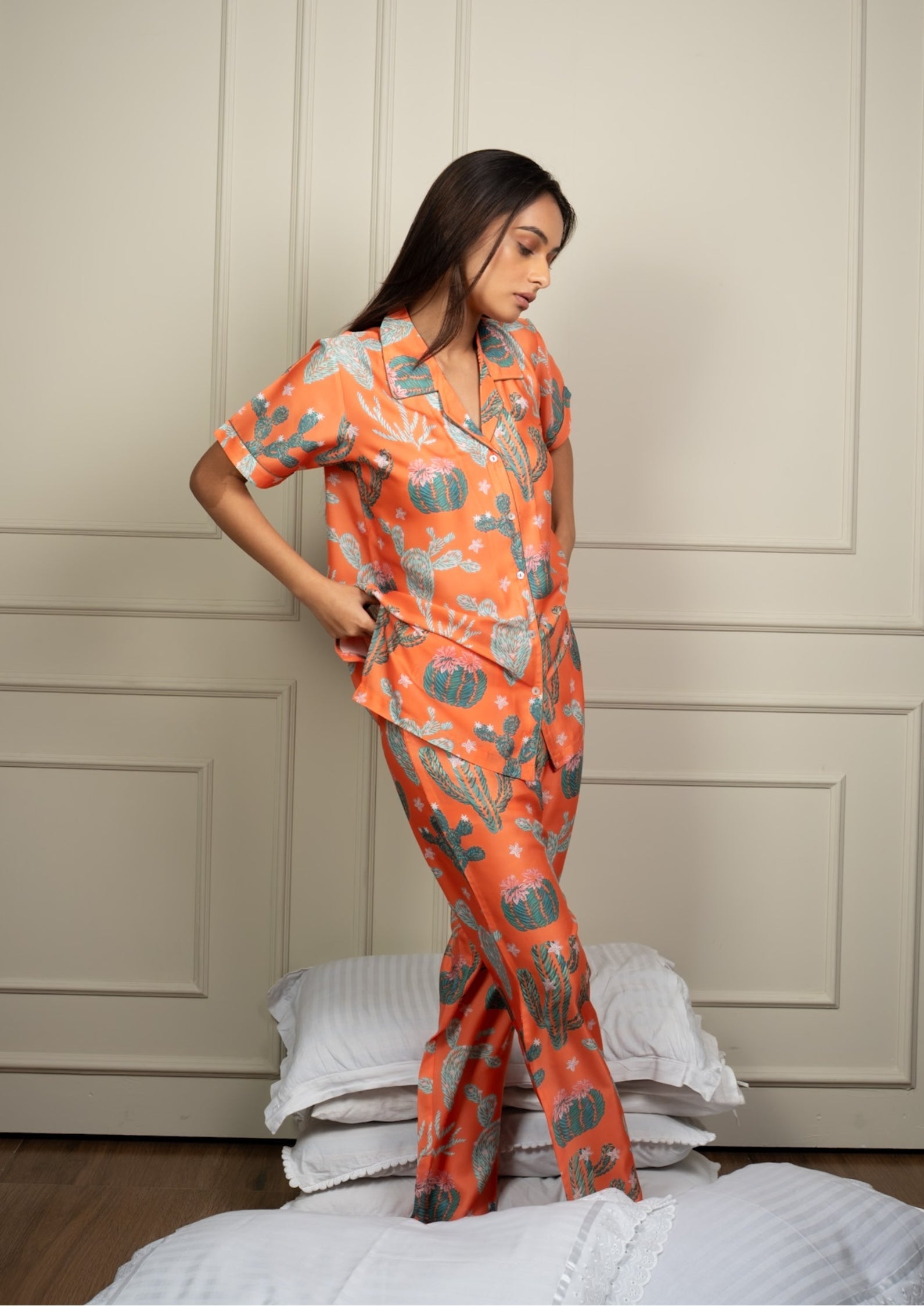 Step into effortless luxury with the Tropical Satin Printed Pajama Set — a chic and playful take on classic nightwear. Crafted from premium satin with a silky-smooth touch, this vibrant cactus-inspired set combines comfort, color, and elegance for year-round lounging in style.