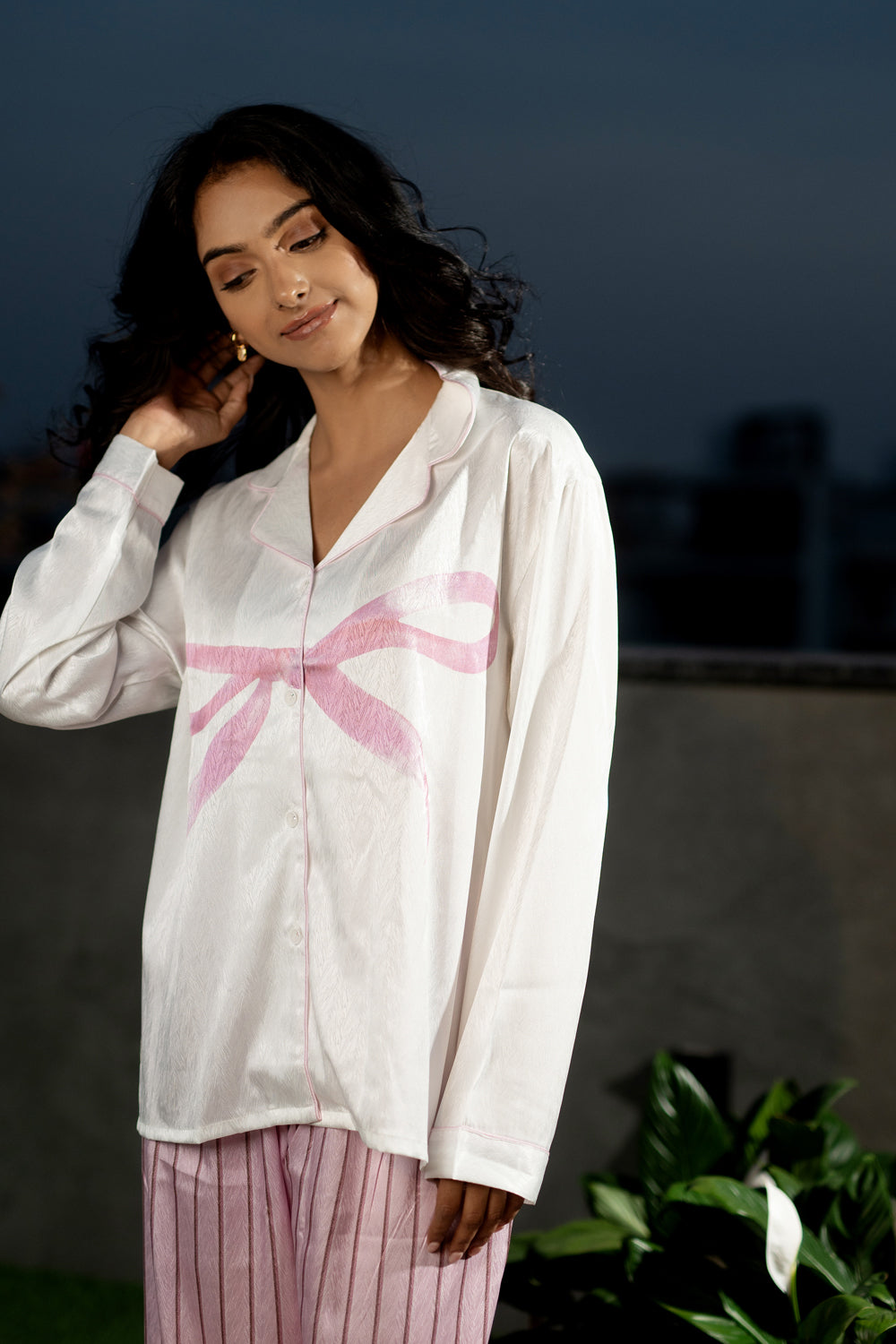 Soft, chic, and thoughtfully detailed — this satin night suit pairs a classic collar top with a playful bow accent and timeless striped pajama bottoms. Crafted in silky-soft satin for a luxe hand feel, it’s designed for relaxed evenings and restful nights, blending comfort with understated elegance.