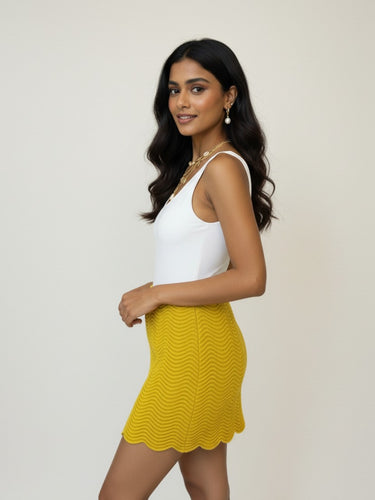 Brighten up your look with this ribbed knit yellow mini skirt, designed to make a statement with its bold color and chic detailing. The textured ribbed pattern and scalloped hemline add a playful twist, while the stretchable knit ensures a flattering and comfortable fit. Perfect for pairing with crop tops, shirts, or blouses.