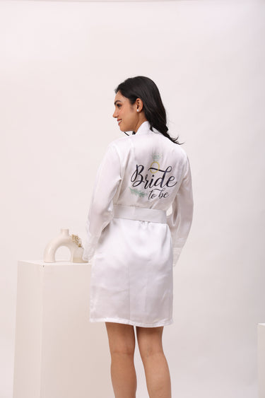 Celebrate your special moments in timeless elegance with this white satin bridal robe. Featuring delicate lace detailing on the sleeves and back, and a graceful “Bride-to-Be” print, this flowy silhouette is made for picture-perfect memories.