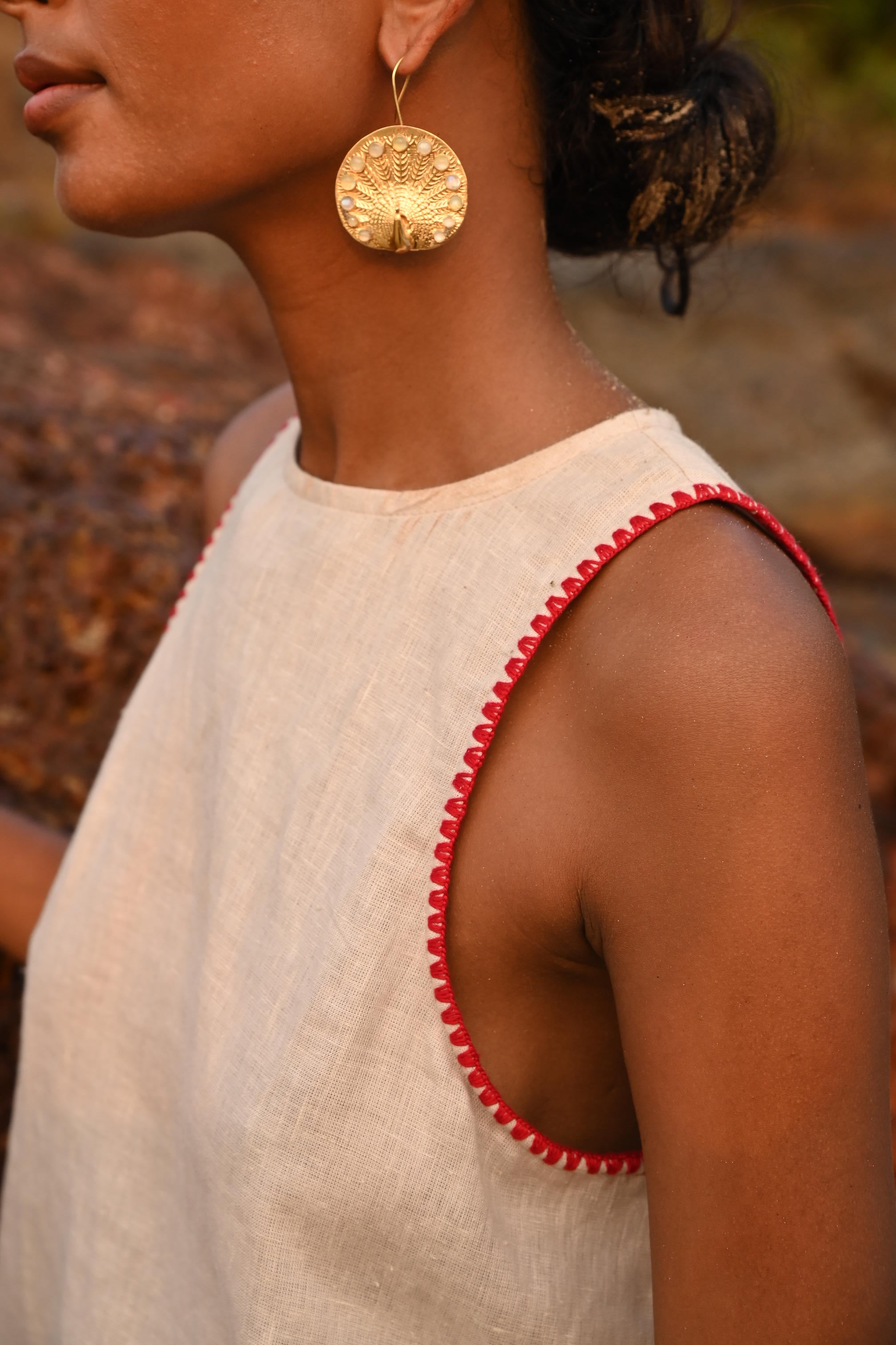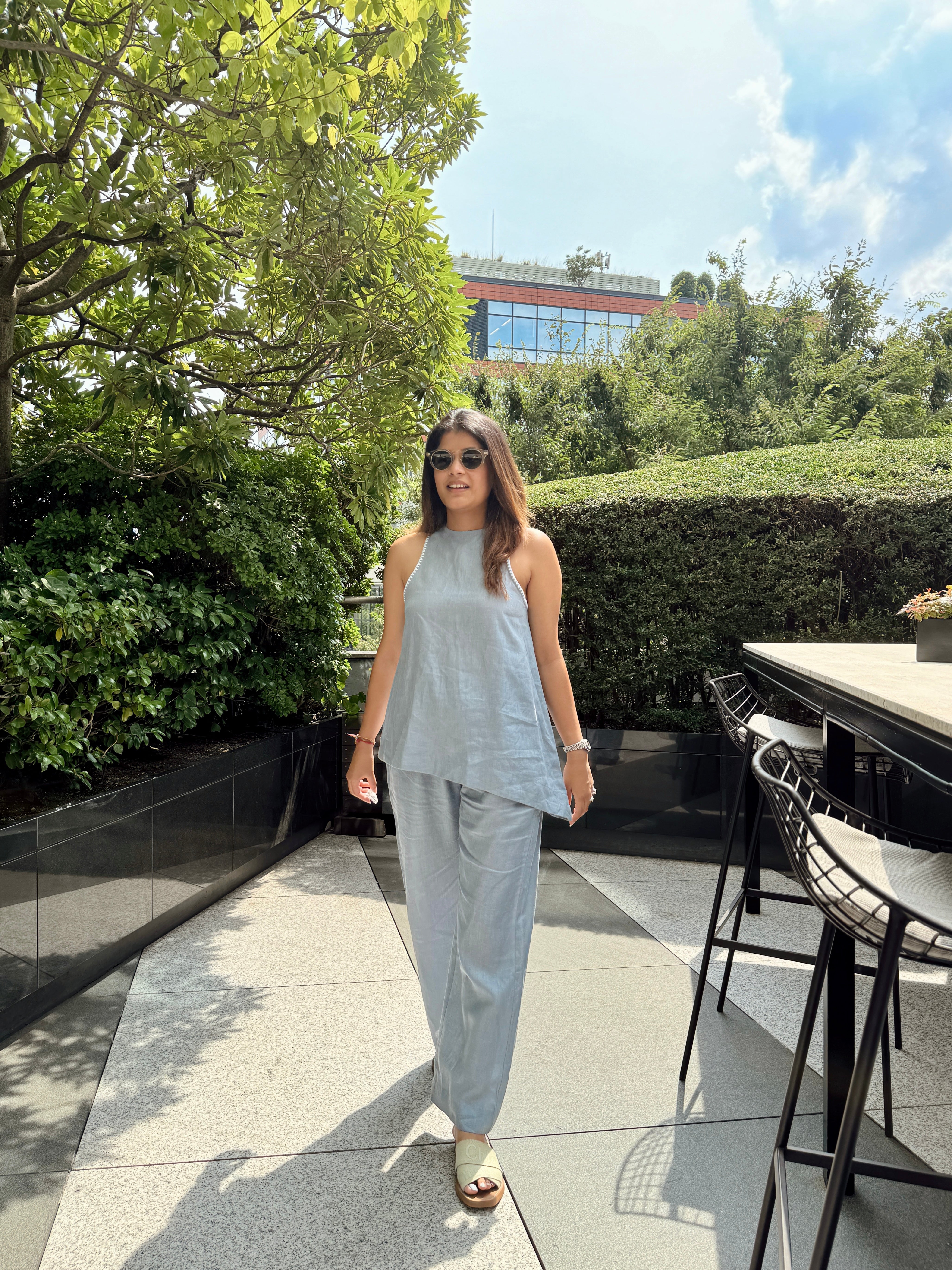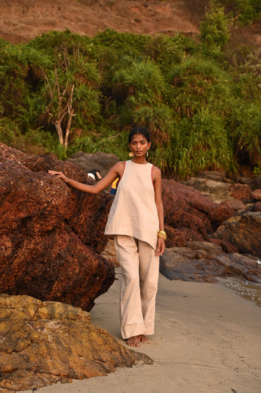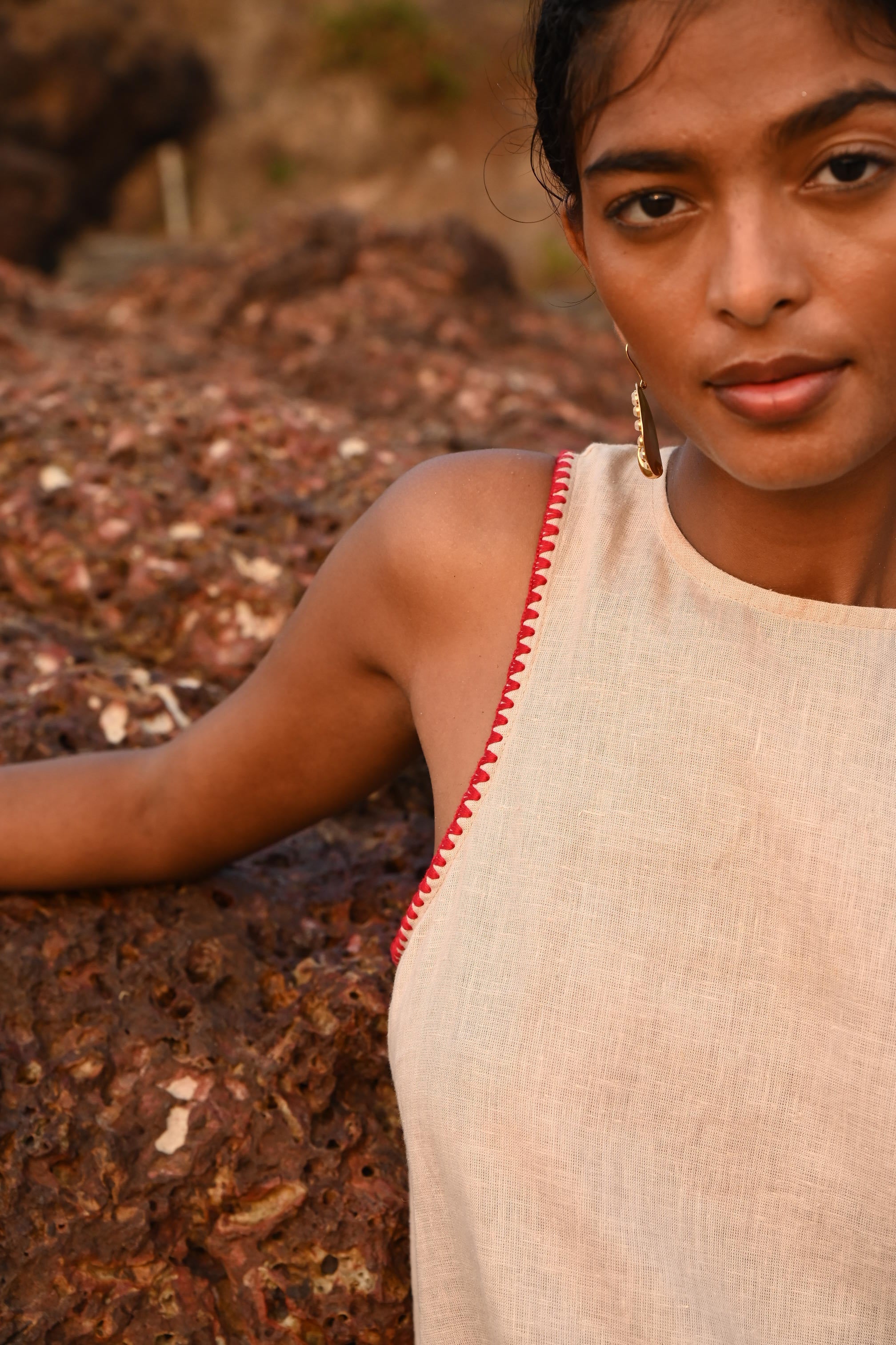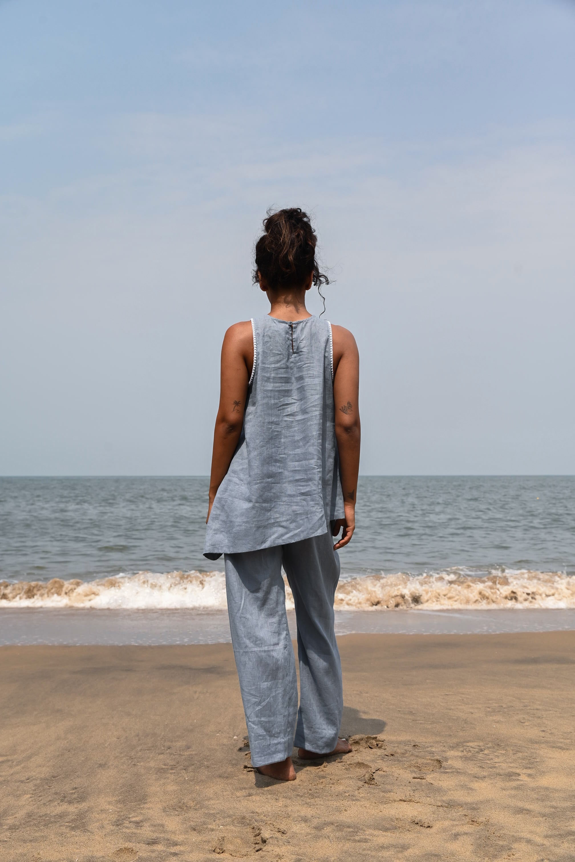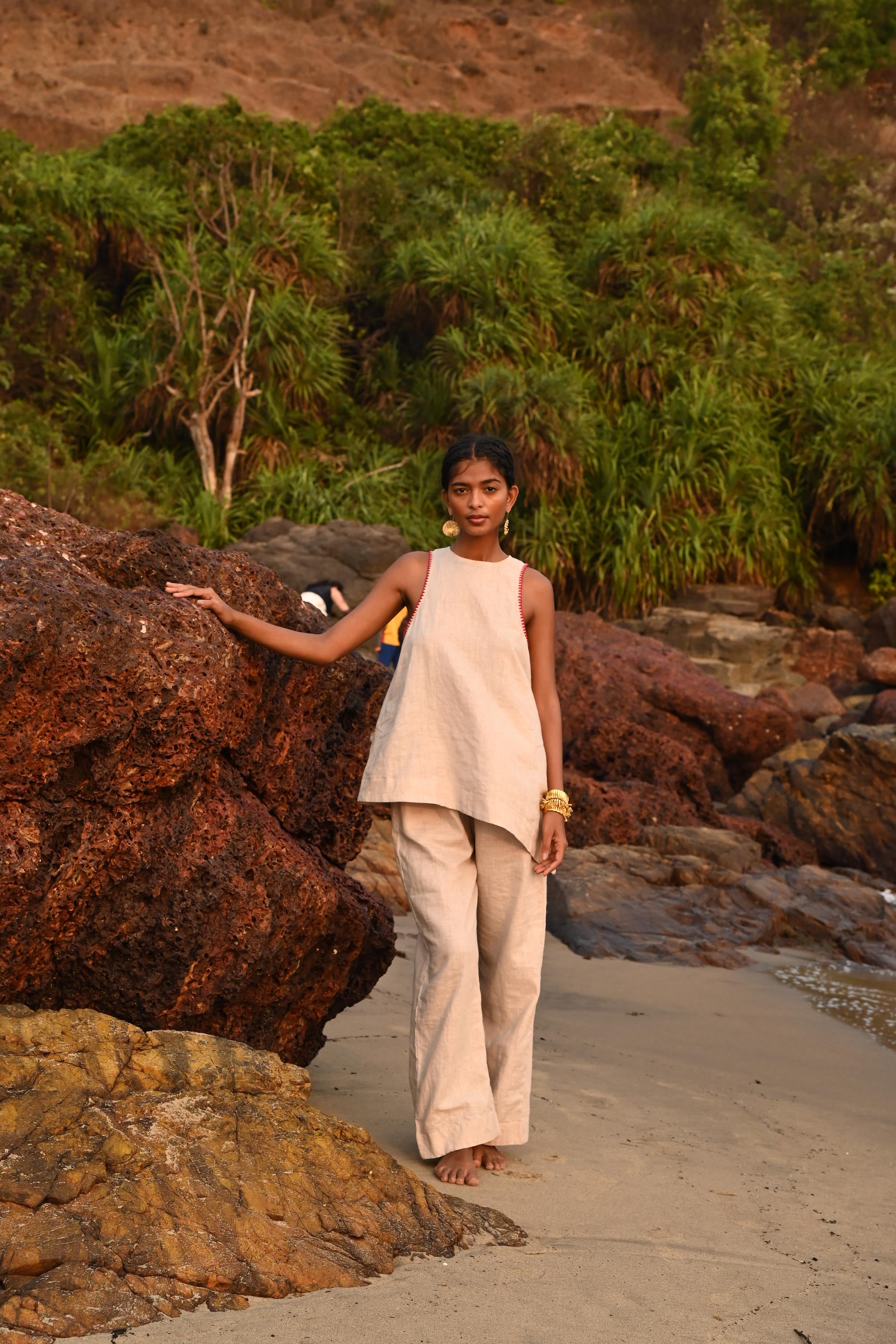 Chic and lightweight, this European linen top is designed in a relaxed fit with a flattering halter neckline. The asymmetric hem adds a modern edge, while delicate embroidery around the armholes enhances its artisanal charm. Perfect for warm-weather dressing, it pairs effortlessly with skirts, shorts, or tailored trousers.