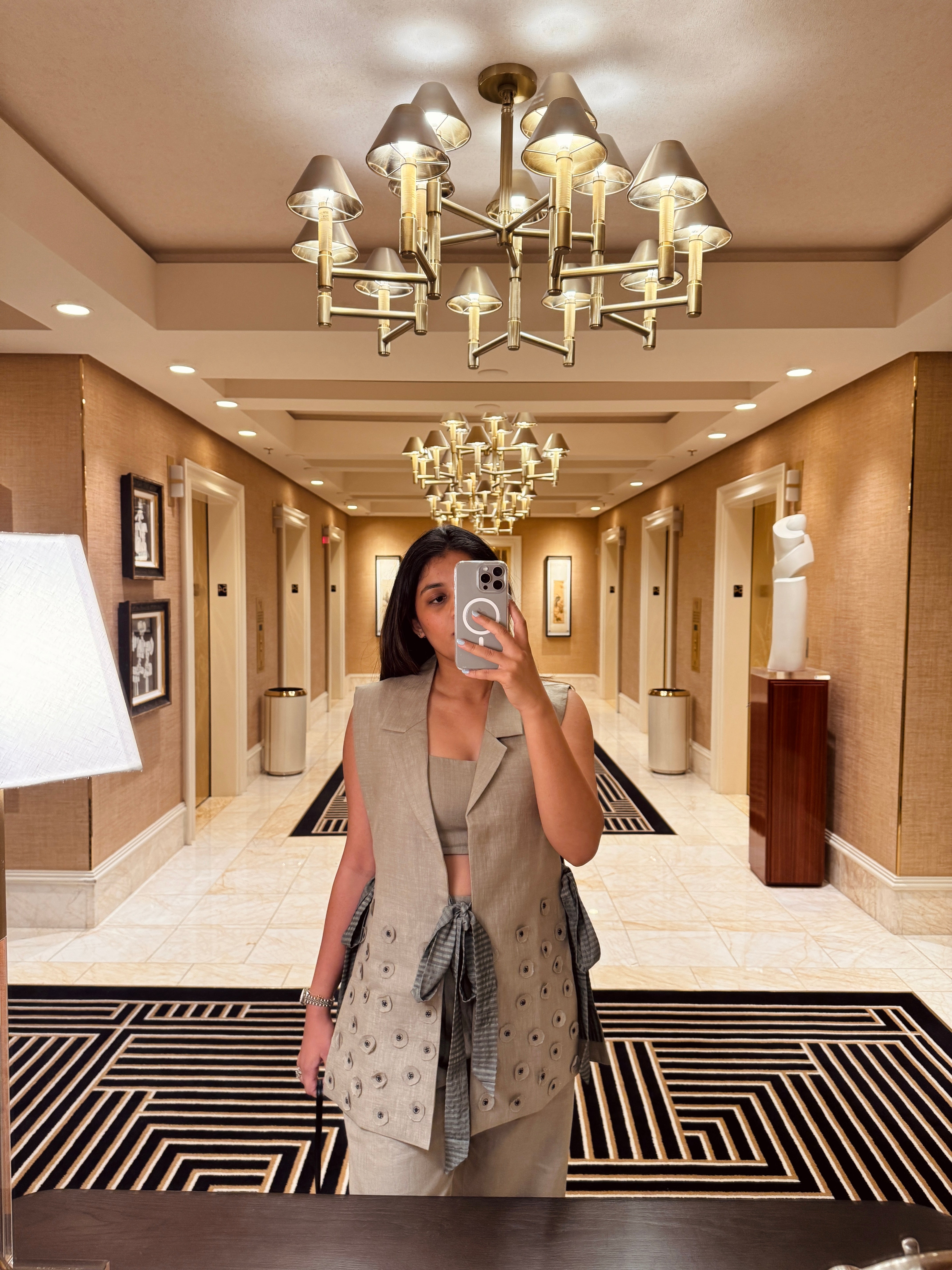 Crafted in 100% European linen, this top is elevated with intricate circle surface manipulation and delicate French knot embroidery. Finished with contrast tie-ups, it blends artisanal craftsmanship with a modern edge. Lightweight and versatile, it’s perfect for layering or styling solo for a refined resort look.