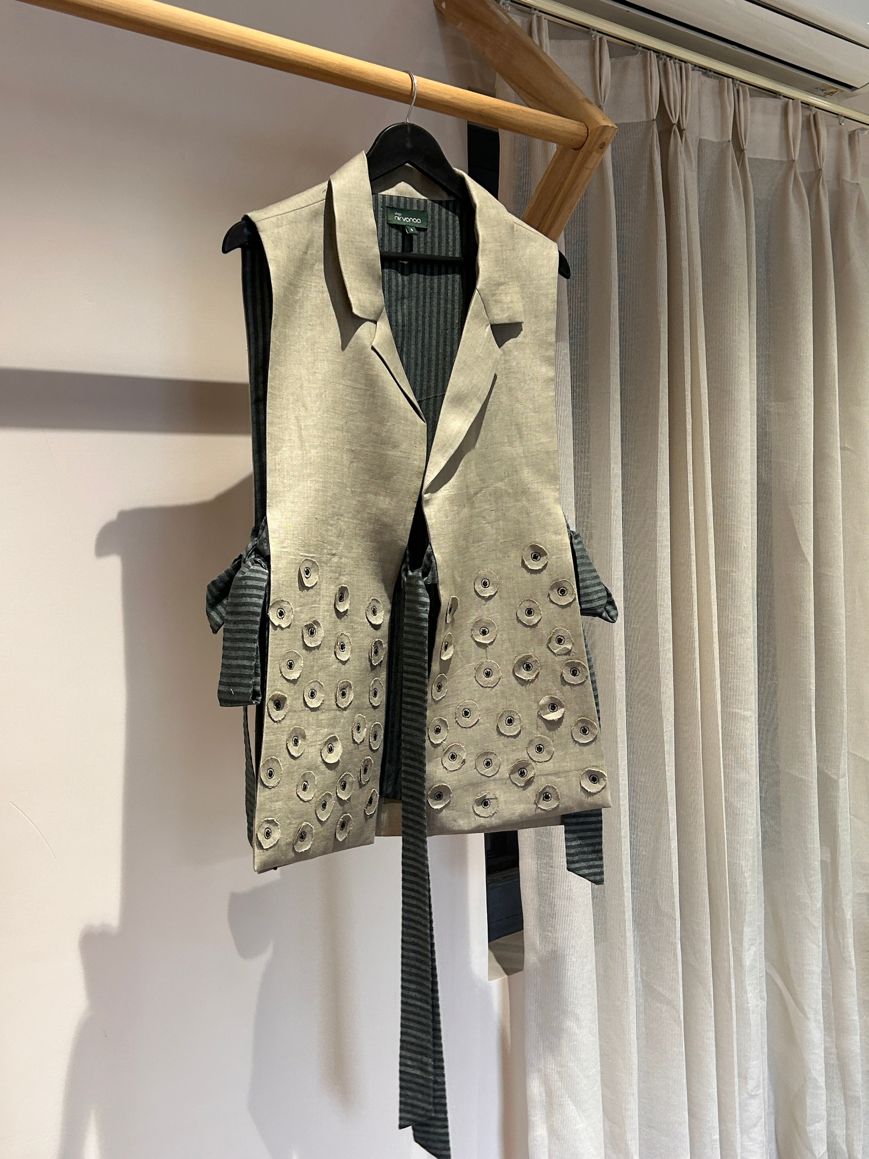 Artisanal detail meets everyday comfort in this European linen co-ord set. Featuring circle surface manipulation with delicate French knot accents and contrast tie-ups, the top brings a handcrafted touch to modern resortwear. Paired with elasticated pants for an easy, relaxed fit, this set is perfect for both elevated daywear and holiday escapes.