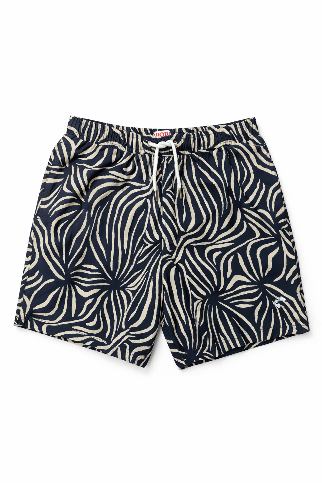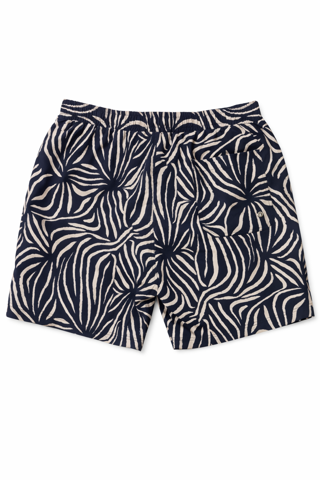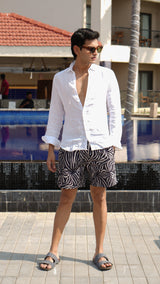 Make a bold statement with Shore Borne's Midnight Marble swim shorts, inspired by the rich artistry of marble cake. These swimming trunks showcase a striking abstract pattern in deep black with flowing cream swirls, creating an elegant contrast that turns heads while blending artistic flair with everyday practicality.