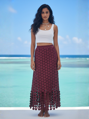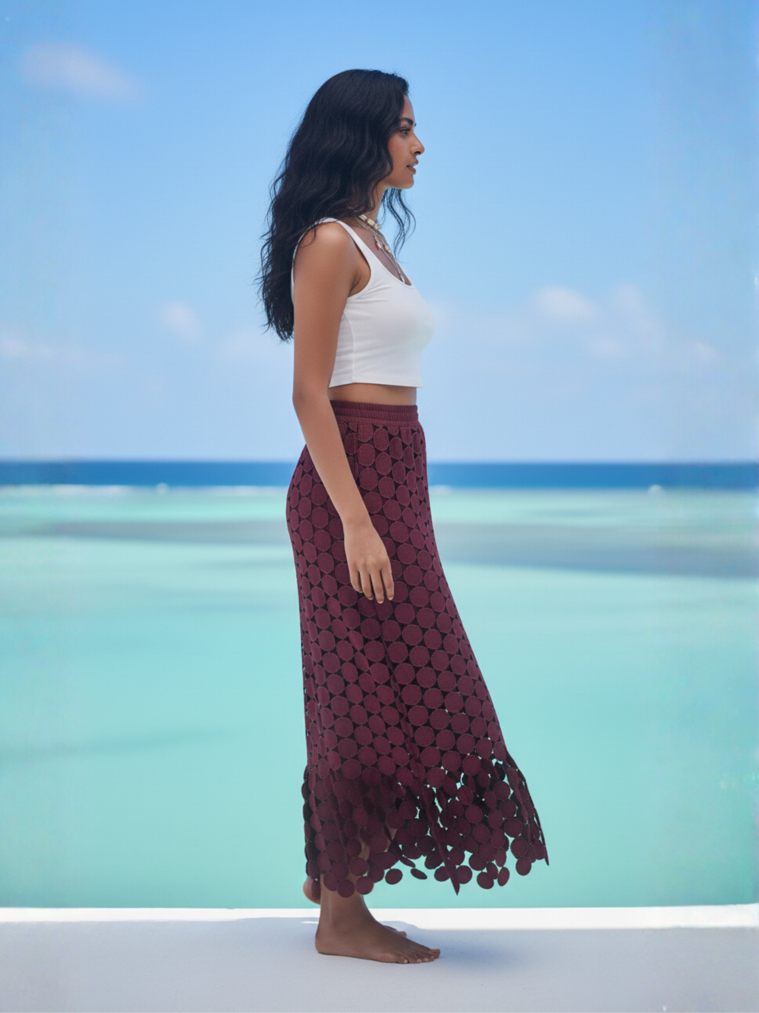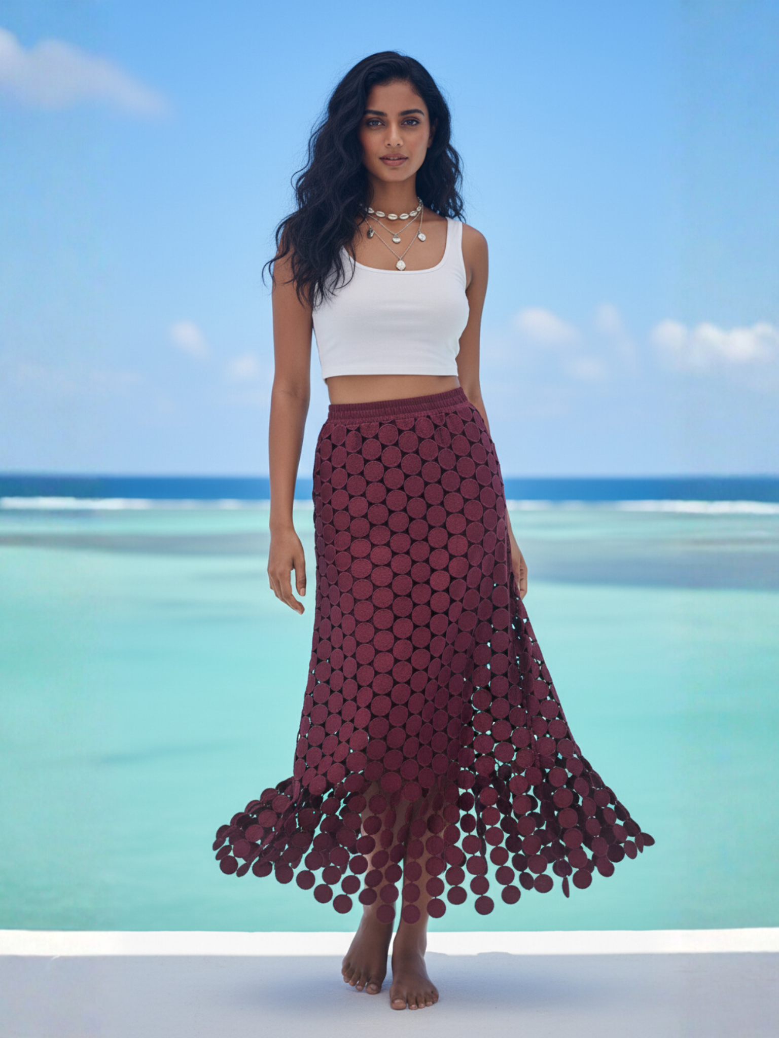 Effortless sophistication meets playful texture in our Resort Luxe Wine Skirt. Crafted in a deep wine hue, this statement piece features an intricate circular cut-out design that flows beautifully with every step. The semi-sheer finish adds a hint of allure, while the high-waist elastic band ensures a comfortable, flattering fit. Perfect for layering over swimwear or pairing with a simple crop top, this skirt transitions seamlessly from beachside brunches to sunset soirées.