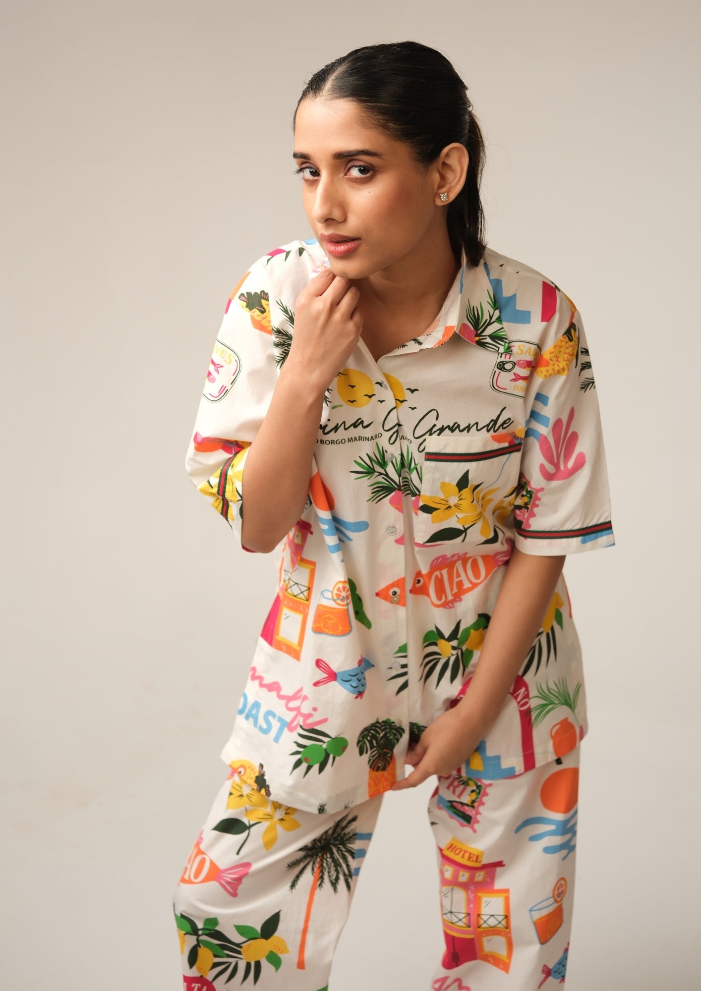 Bring holiday vibes to your evenings with the Amalfi Dreams Printed Night Suit — a cheerful blend of comfort, color, and coastal charm. Inspired by the vibrant motifs of the Amalfi Coast, this playful set combines easy elegance with relaxed comfort, making it perfect for lounging, gifting, or unwinding in style.