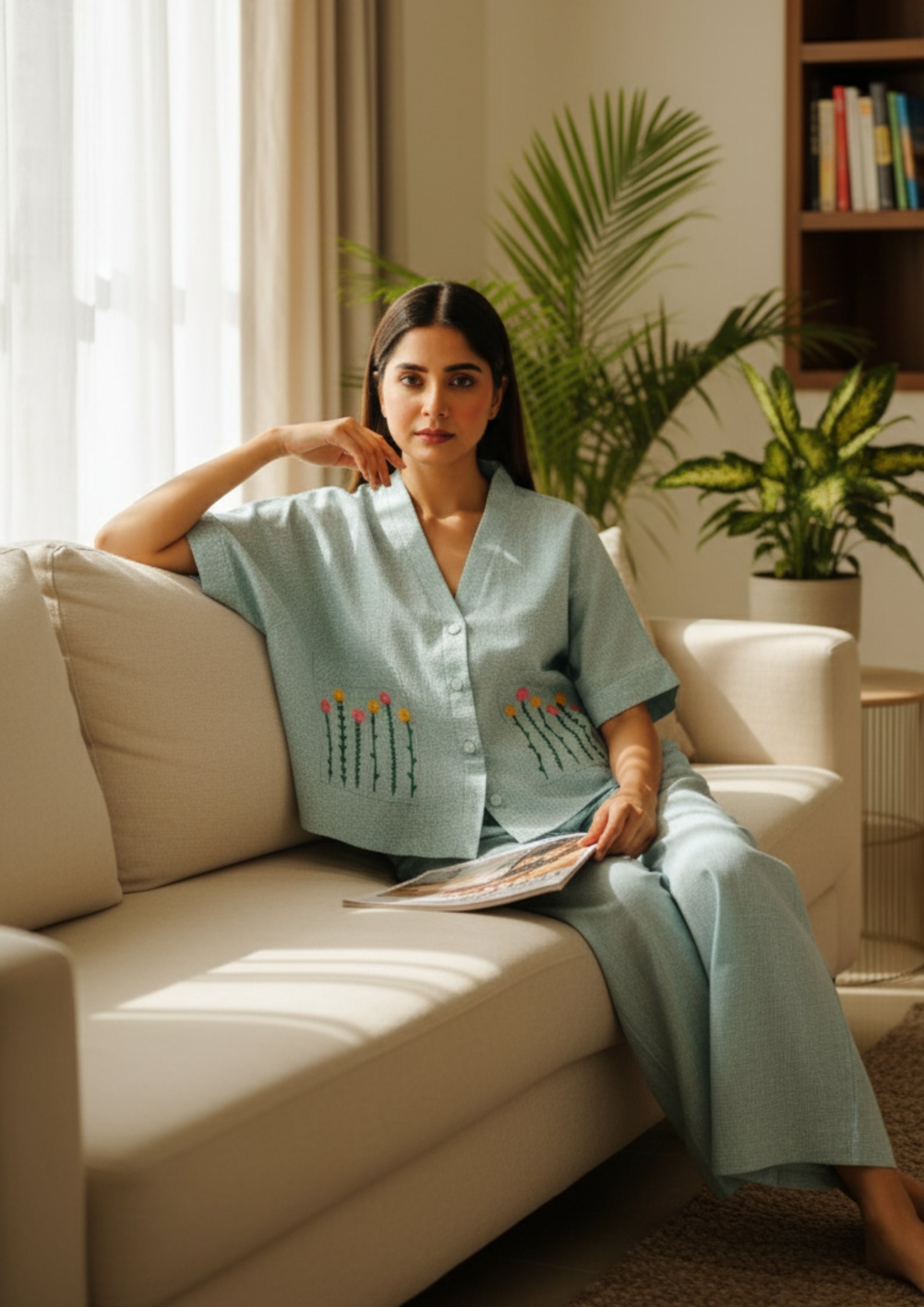 Designed for relaxed elegance, this green anti-fit co-ord set blends thoughtful detailing with everyday comfort. Featuring broad pants and a soft V-neckline, it offers an easy, flattering silhouette for every body type.