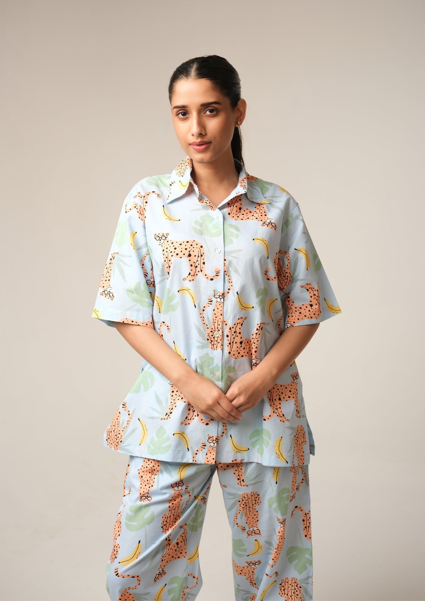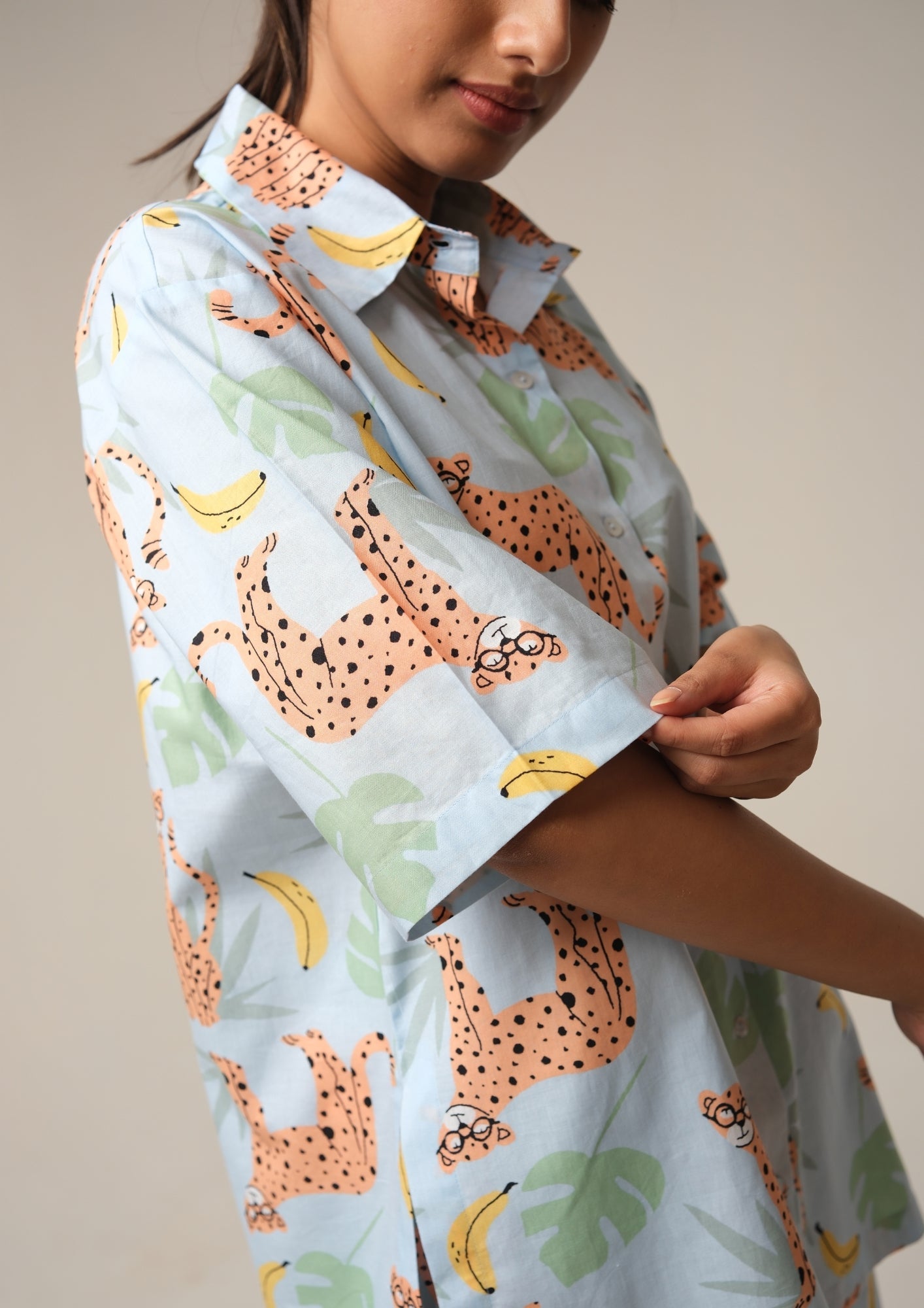 Step into comfort with a playful twist in the Leopard Banana Printed Night Suit — a fun, youthful set that brings personality to your downtime. Featuring a quirky mix of leopard spots, banana motifs, and foliage on a soothing pastel blue base, this cozy ensemble combines bold design with effortless comfort.