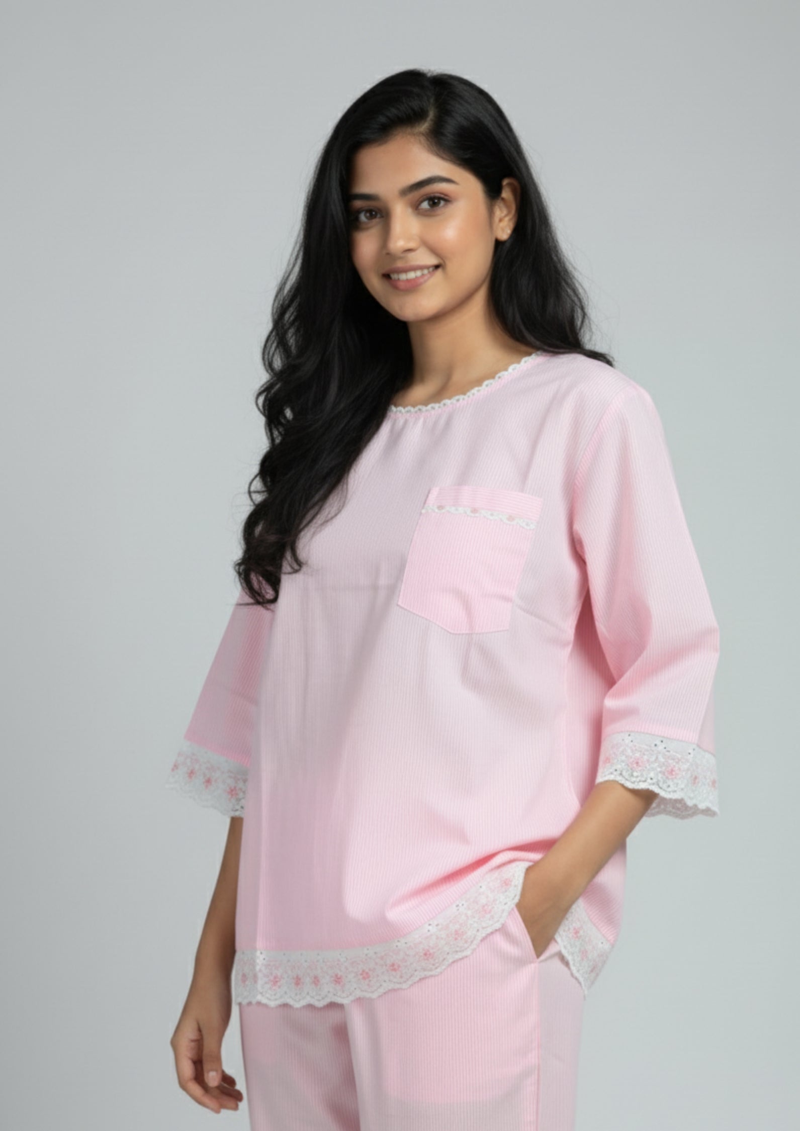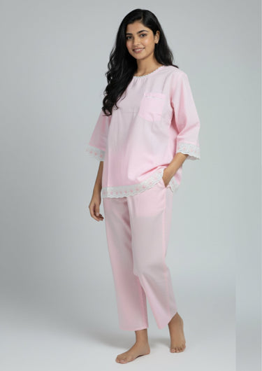 Soft, feminine, and timeless – this pink night suit brings together comfort and elegance in one frame. Delicately finished with lace along the sleeves and hem, it adds a subtle charm to your everyday lounge look. Perfect for cozy nights and relaxed mornings.