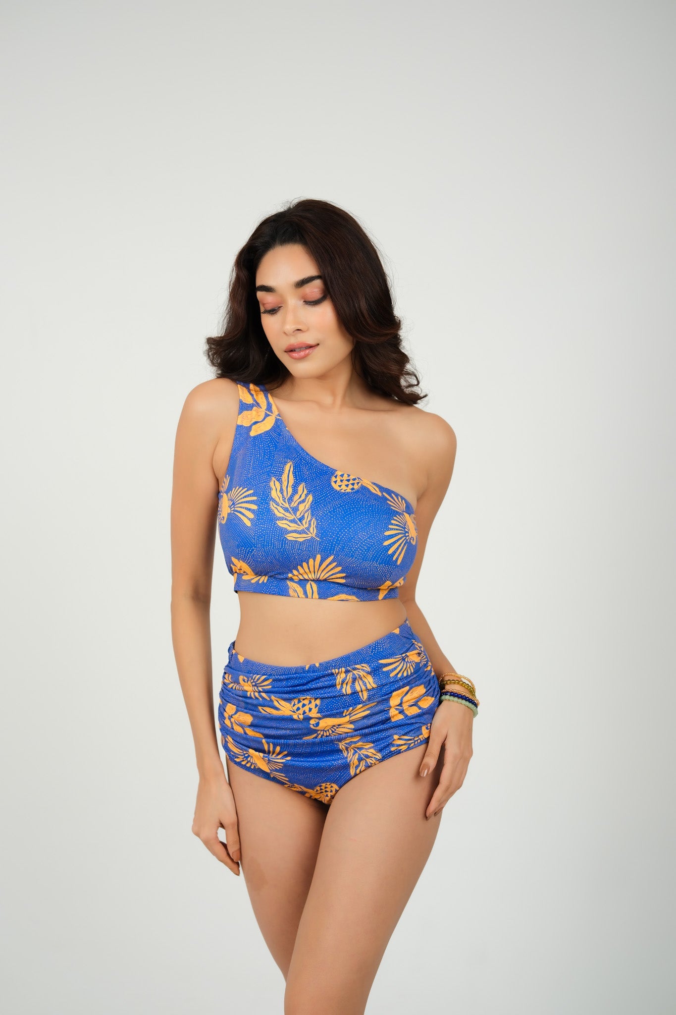 Bold meets elegant in the Cobalt Canopy bikini set — where structured confidence and playful charm collide. The asymmetrical top adds a hint of edge, while the high-waisted bottoms smooth and shape for all-day beachside poise.