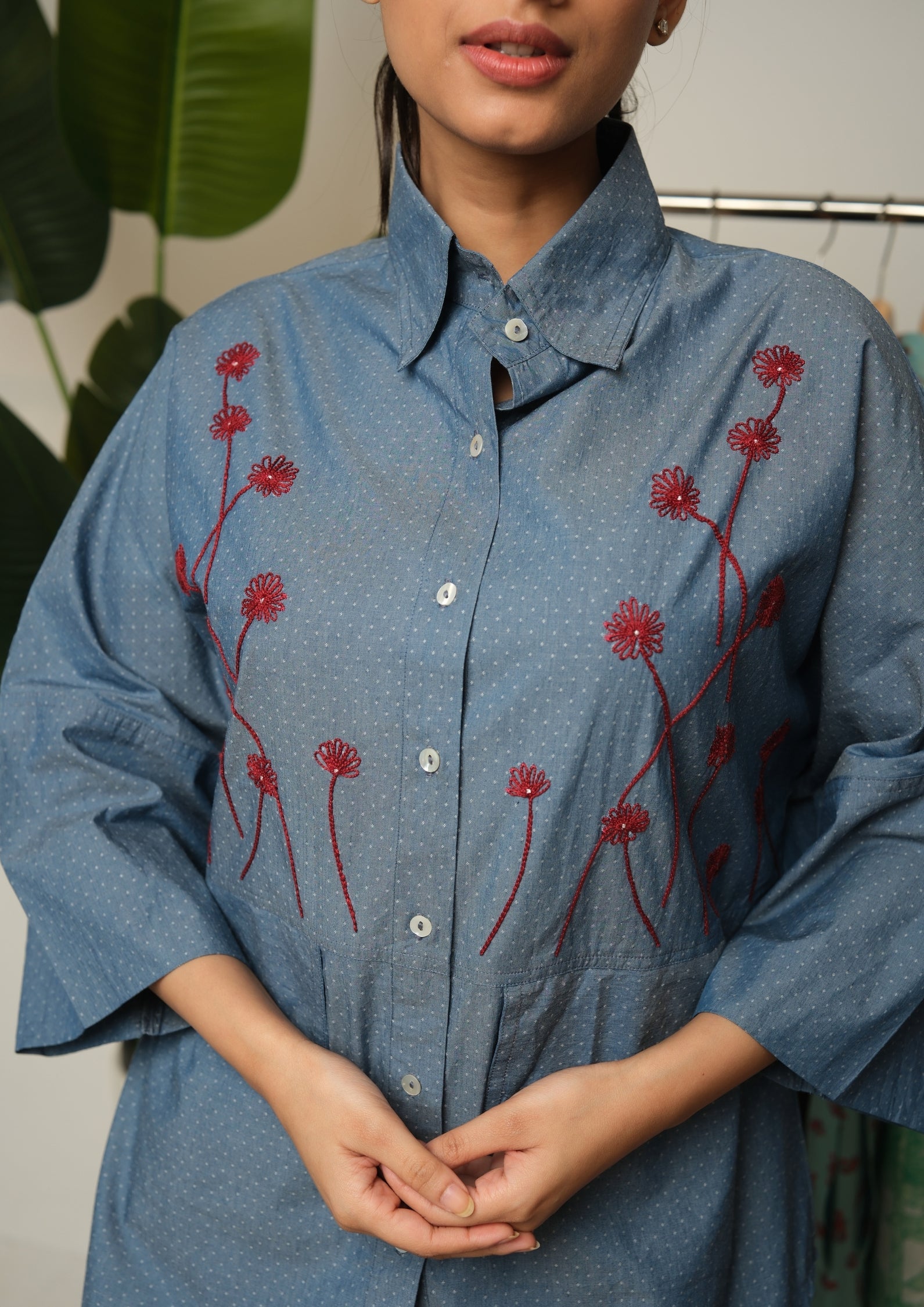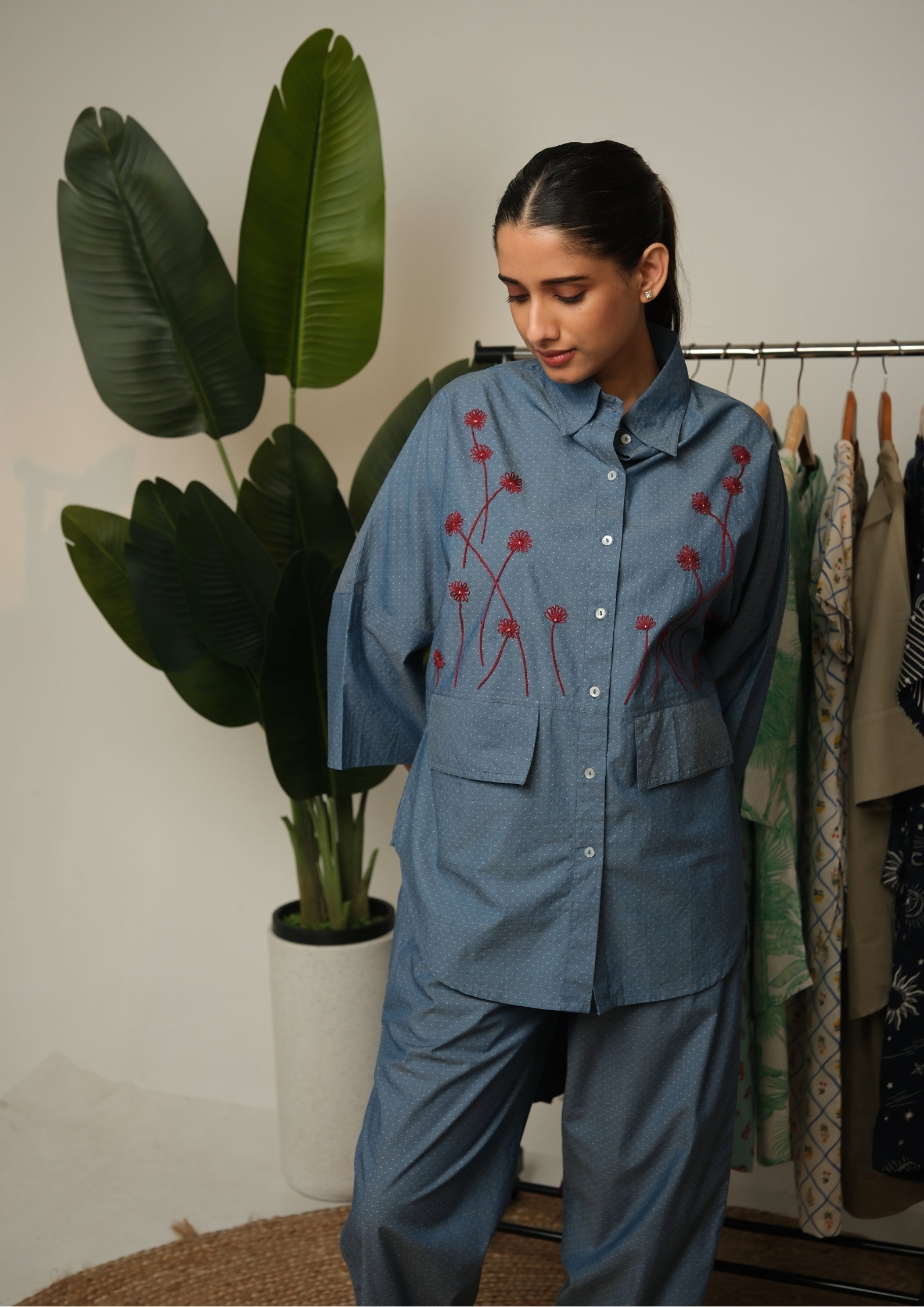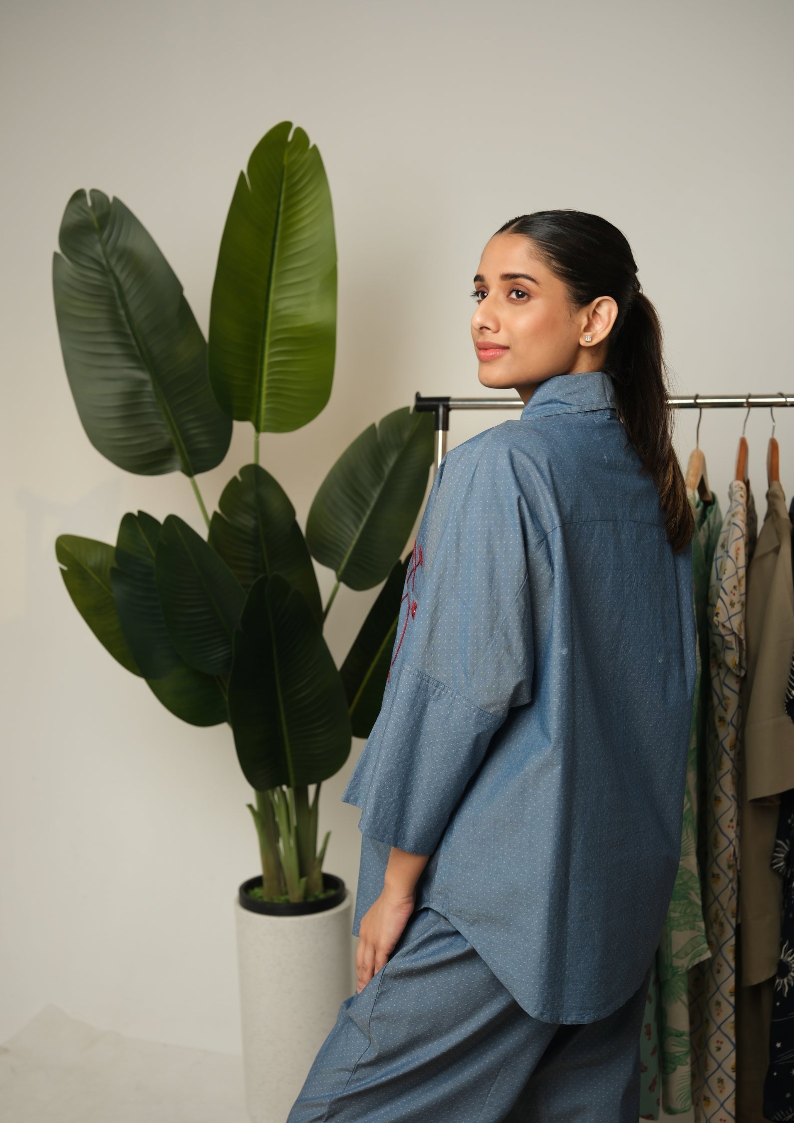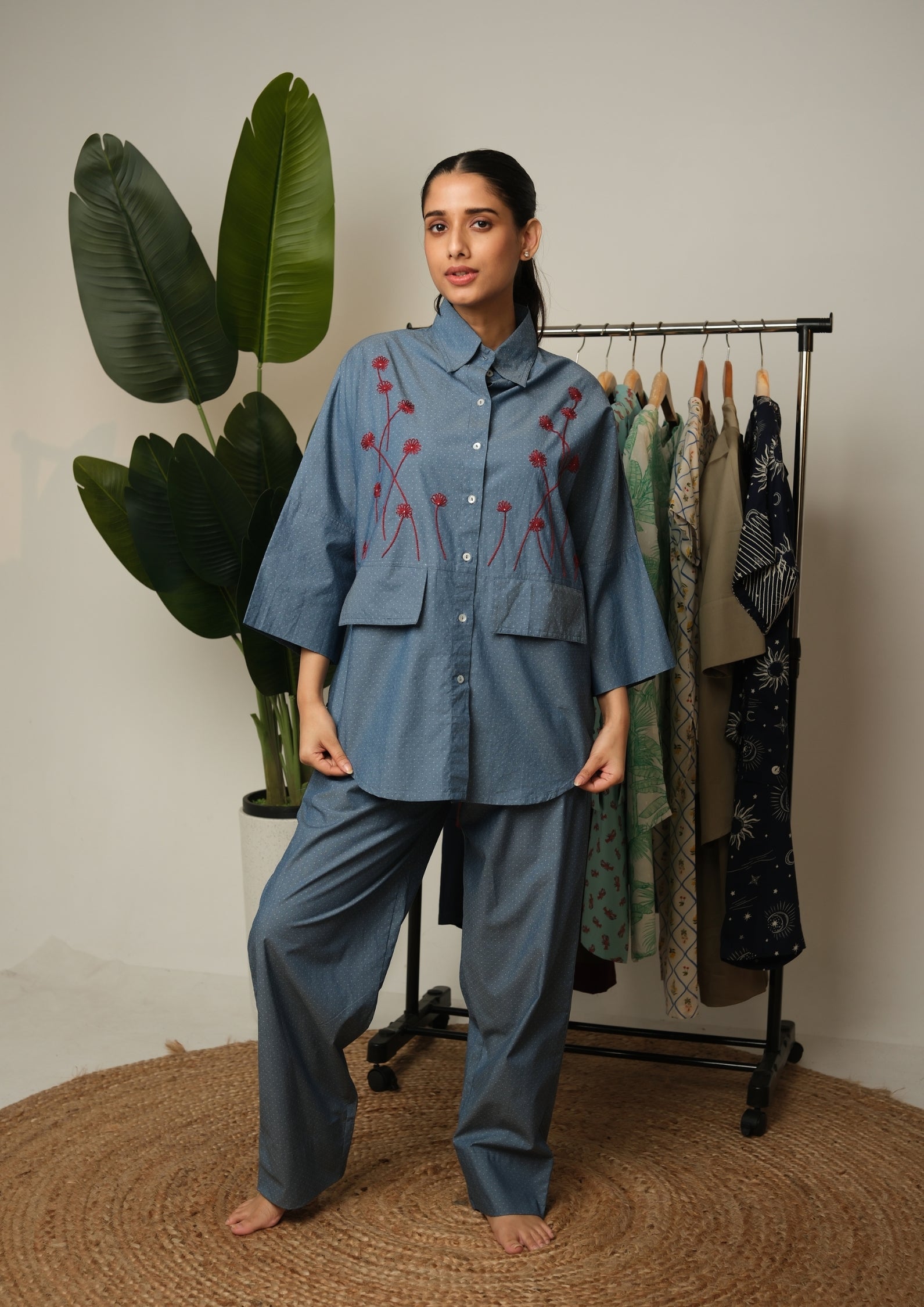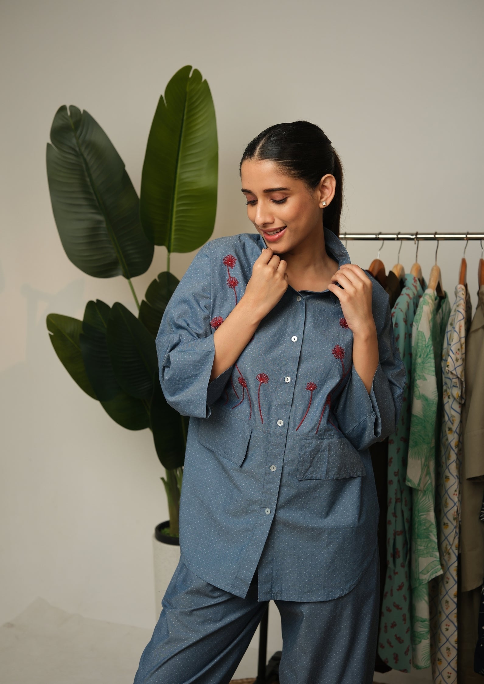 Elevate your everyday style with the Denim Blue Embroidered Co-Ord Set — a perfect blend of comfort, elegance, and modern design. Crafted from a premium cotton-blend fabric in a soothing denim blue tone, this set combines relaxed tailoring with intricate embroidery, making it ideal for both lounging and casual outings.