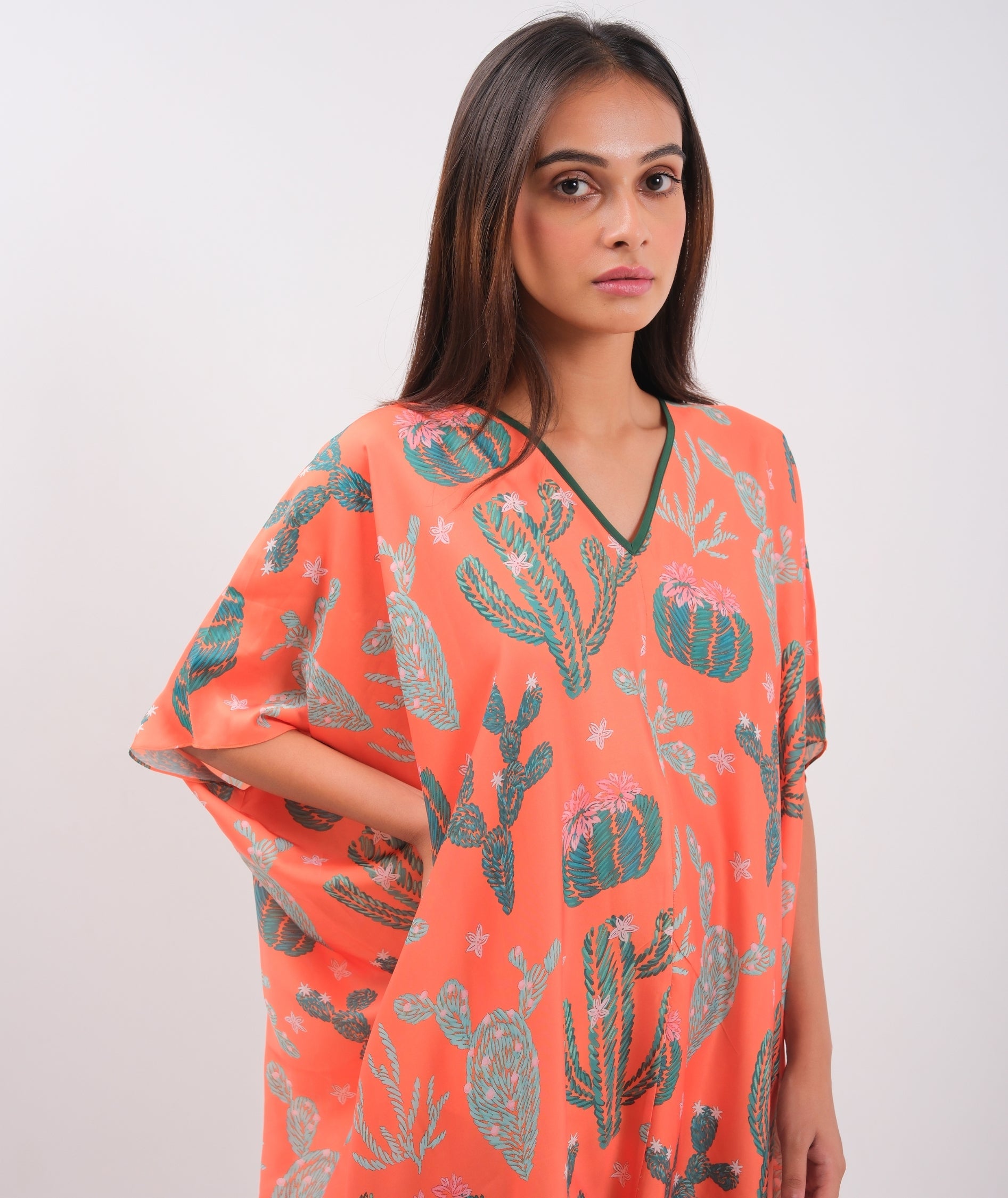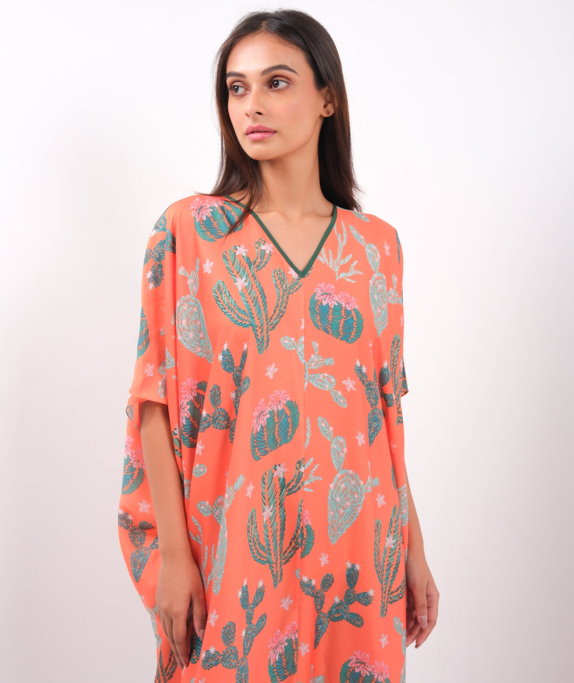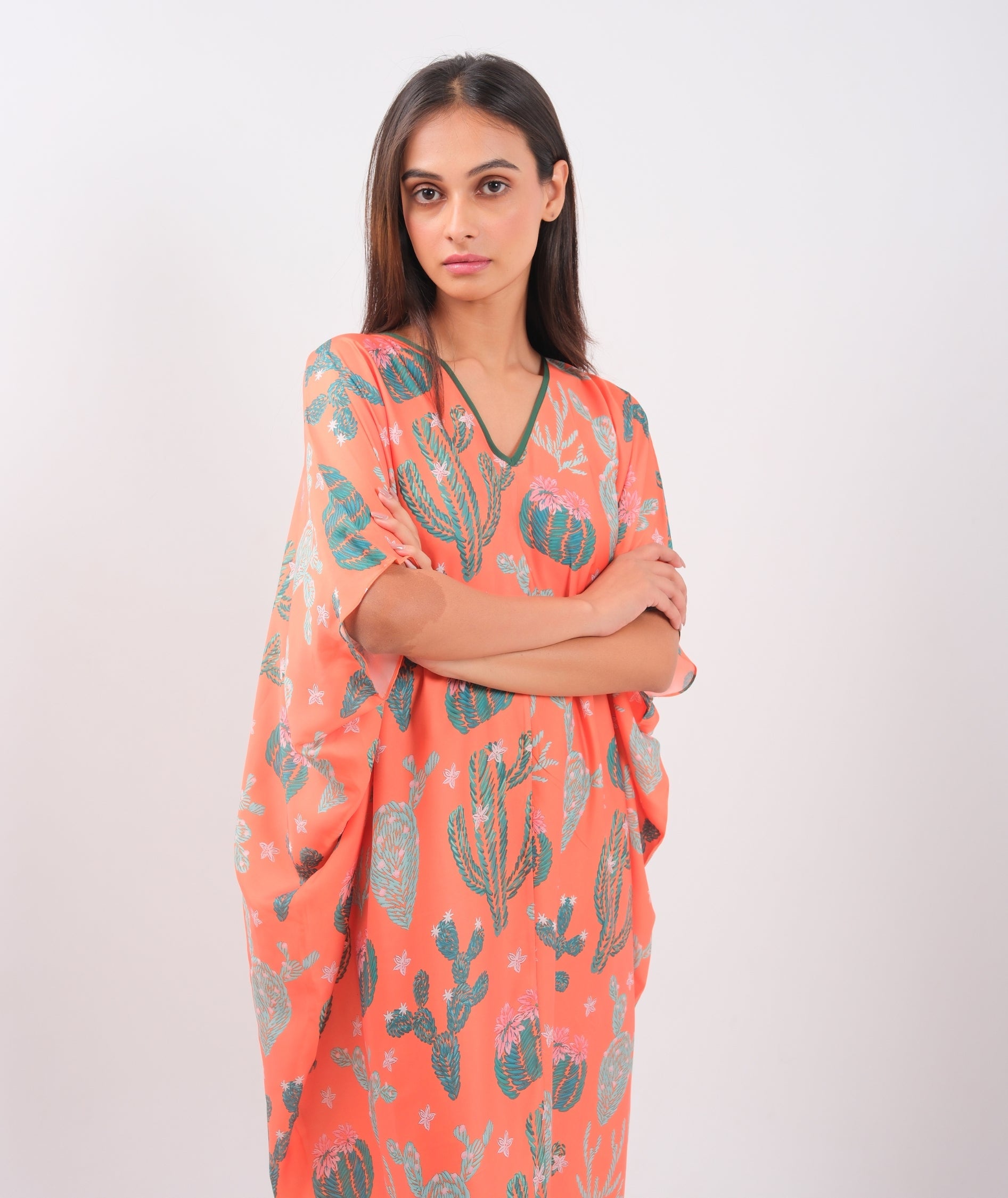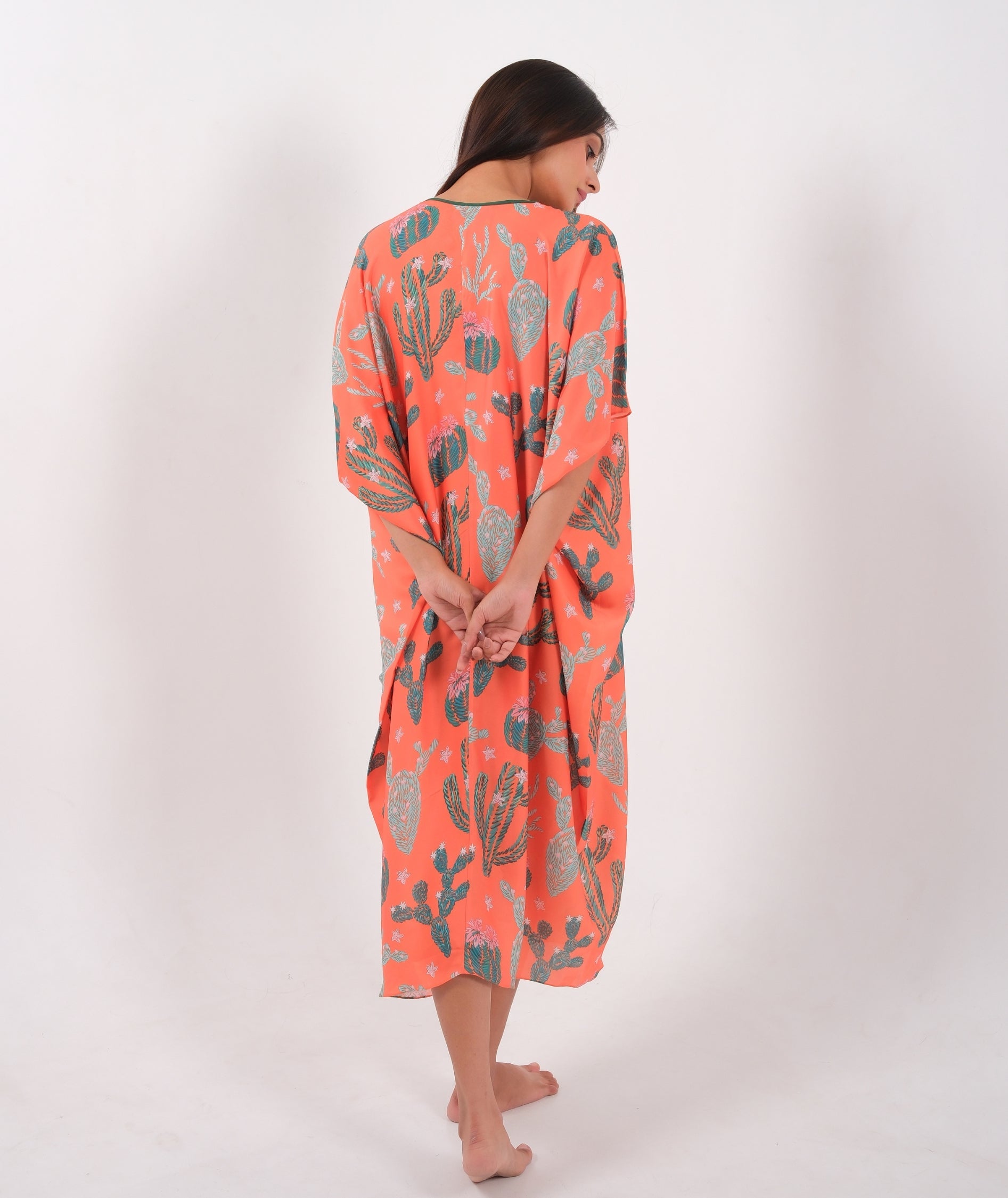 Unwind in style with this bold and breezy kaftan dress, crafted for days when comfort and statement go hand in hand. Featuring a striking cactus-inspired print over a vibrant coral base, this free-flowing silhouette is your perfect beach-to-brunch companion. Whether you're sipping cocktails or walking barefoot in the sand, this piece delivers effortless elegance with a touch of playful charm.