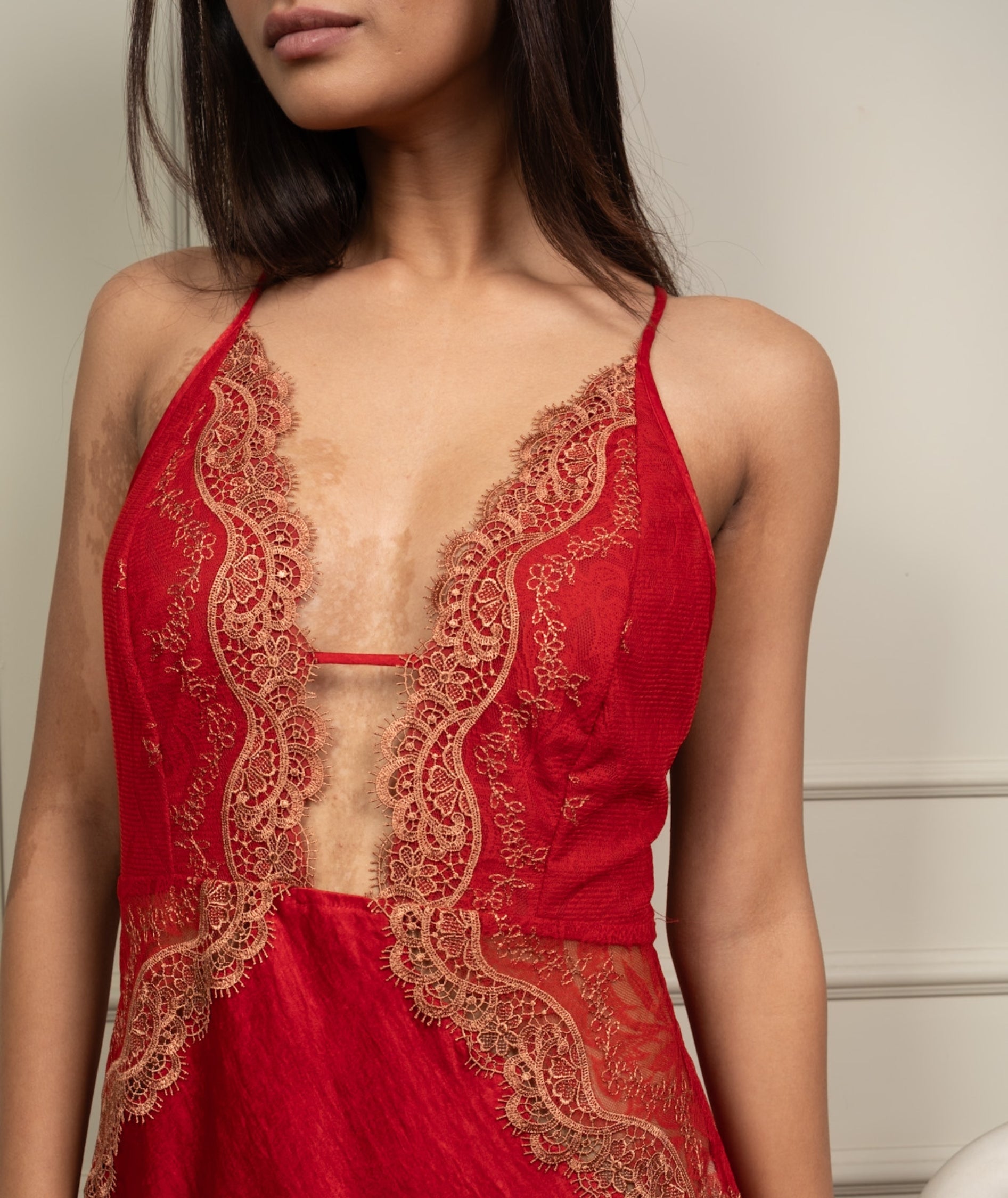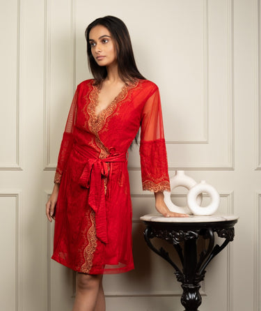 Command attention in this sensuous 3-piece red bridal gown set, designed for the bold and beautiful. Featuring a scalloped lace-trimmed robe, a satin luxurious inner slip, and a coordinated belt, this ensemble exudes elegance and drama. The neckline is crafted with a plunging V-cut and adorned with intricate lacework that adds a regal touch. Perfect for bridal nights, romantic getaways, or gifting with impact.