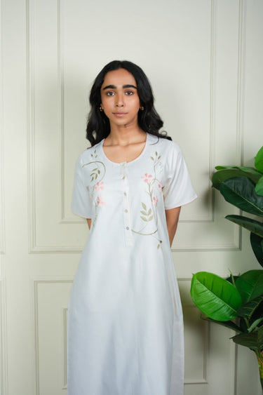 Delicate, pure, and timeless — the Ivory Bloom Cotton Nighty is crafted in breathable cotton with artisanal embroidery for a serene, graceful look. Perfect for peaceful evenings and everyday comfort.