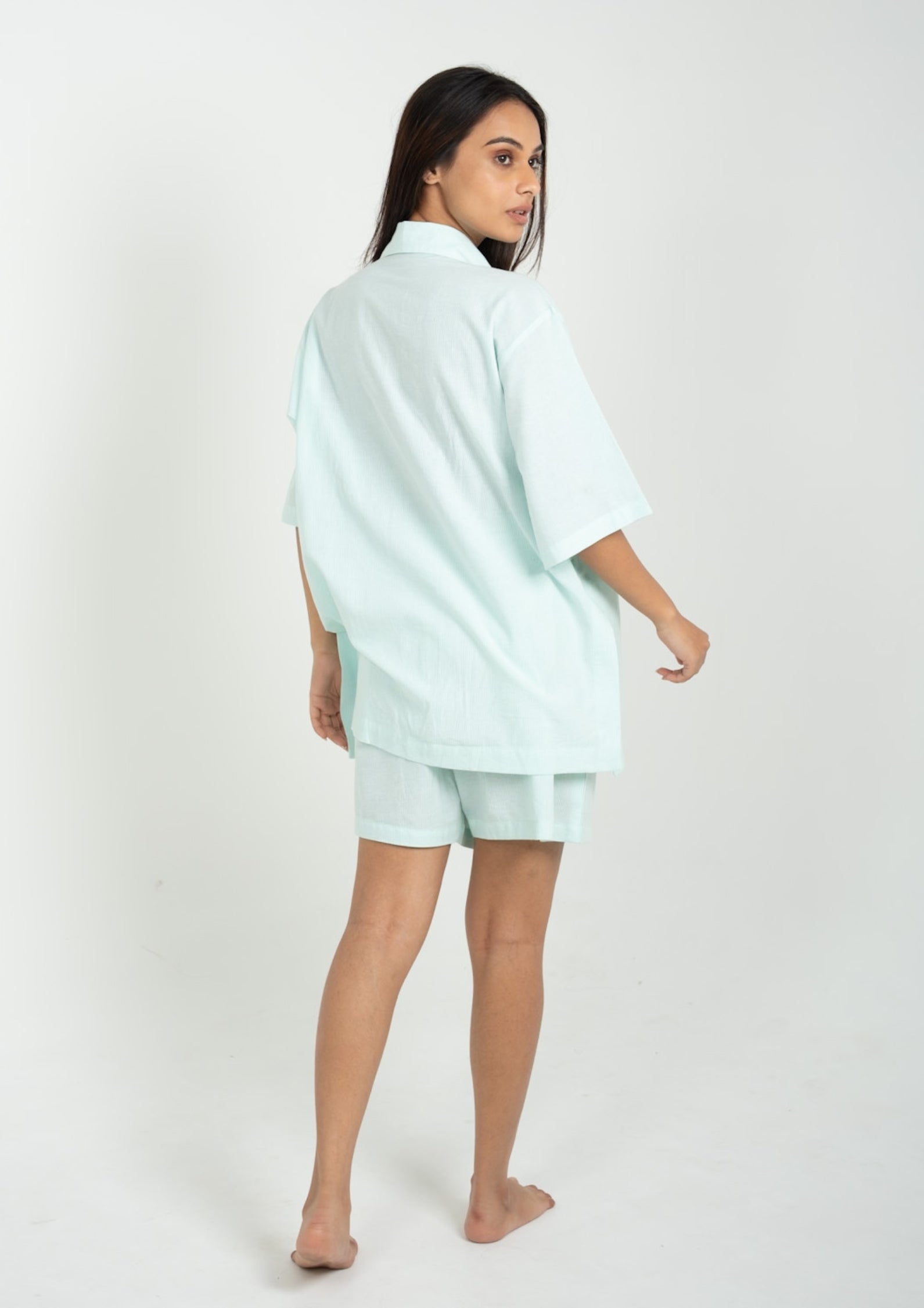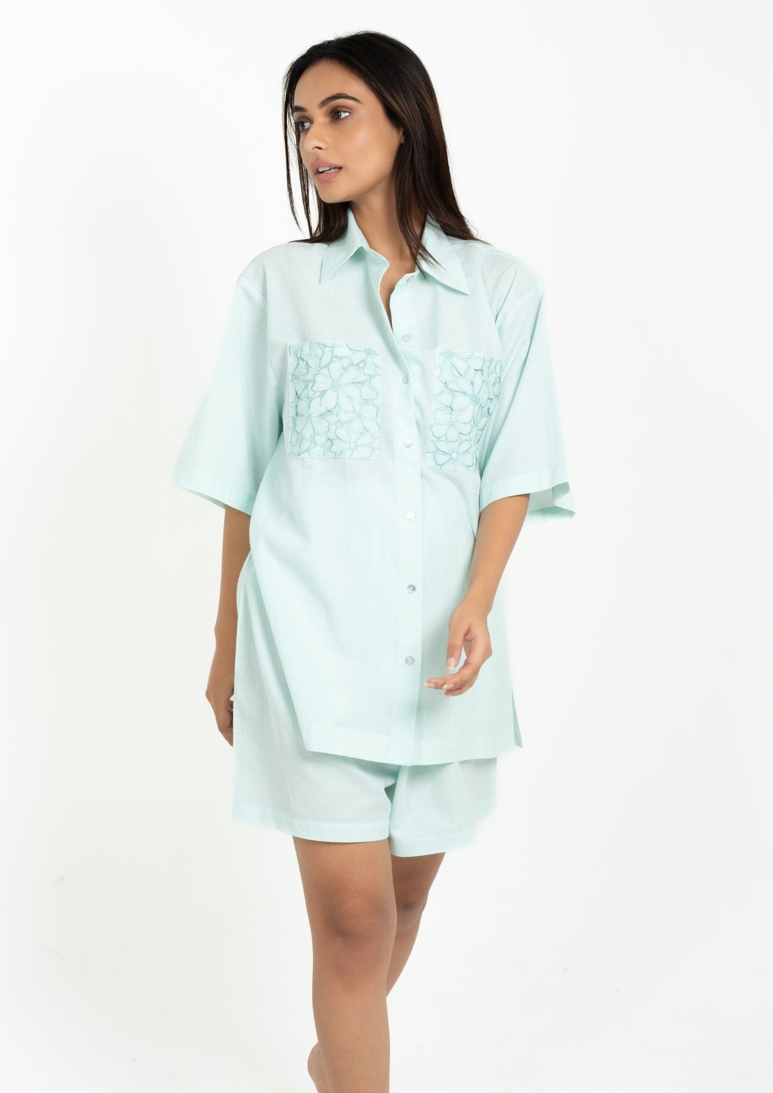 Stay cool, chic, and effortlessly stylish with the Mint Breeze Cotton Shorts Set — a refreshing blend of comfort and charm. Crafted from lightweight, breathable cotton, this set features a relaxed-fit button-down shirt and matching shorts, ideal for lounging, casual outings, or cozy evenings. The soft pastel mint shade paired with delicate embroidery adds a touch of handcrafted elegance to your everyday comfort.