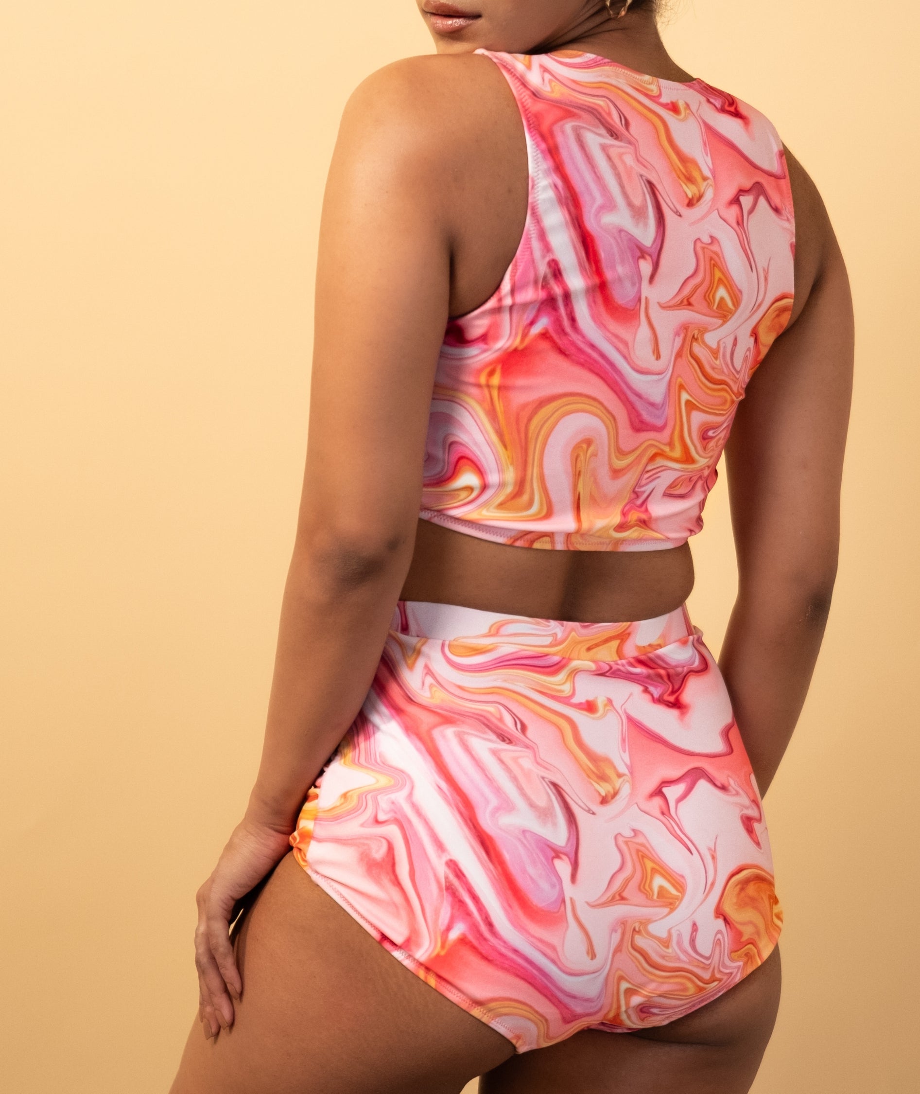 Romance meets rhythm in our Rose Rhapsody Swim Set — a swirl of blush pinks, coral tones, and golden accents that mirror the beauty of marbled art. The twisted front design with a gold embellishment gives a luxe lift to the top, while the high-waisted ruched bottoms enhance your curves and provide confident coverage. Whether you're lounging poolside or catching waves, this suit makes a bold yet feminine statement.