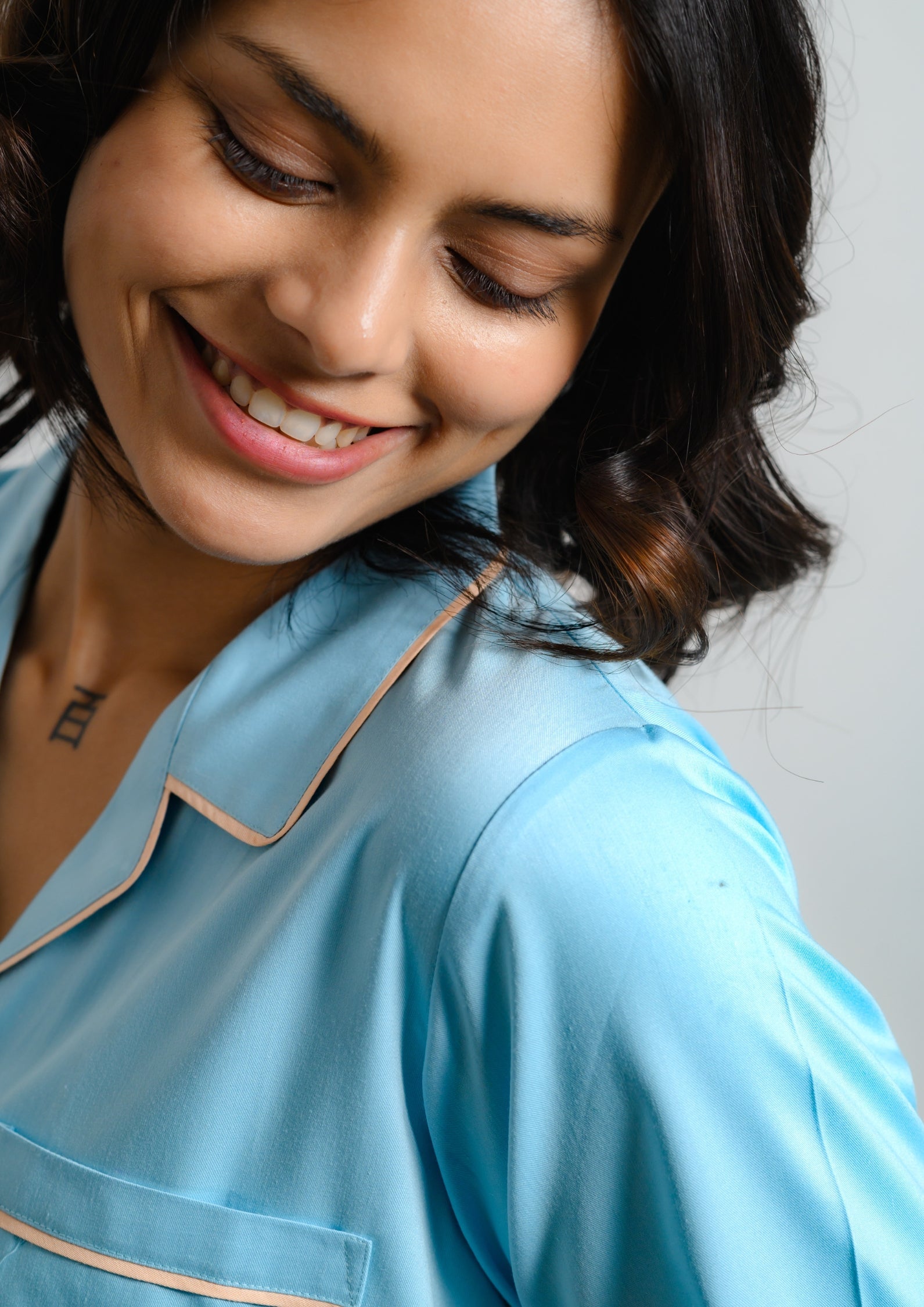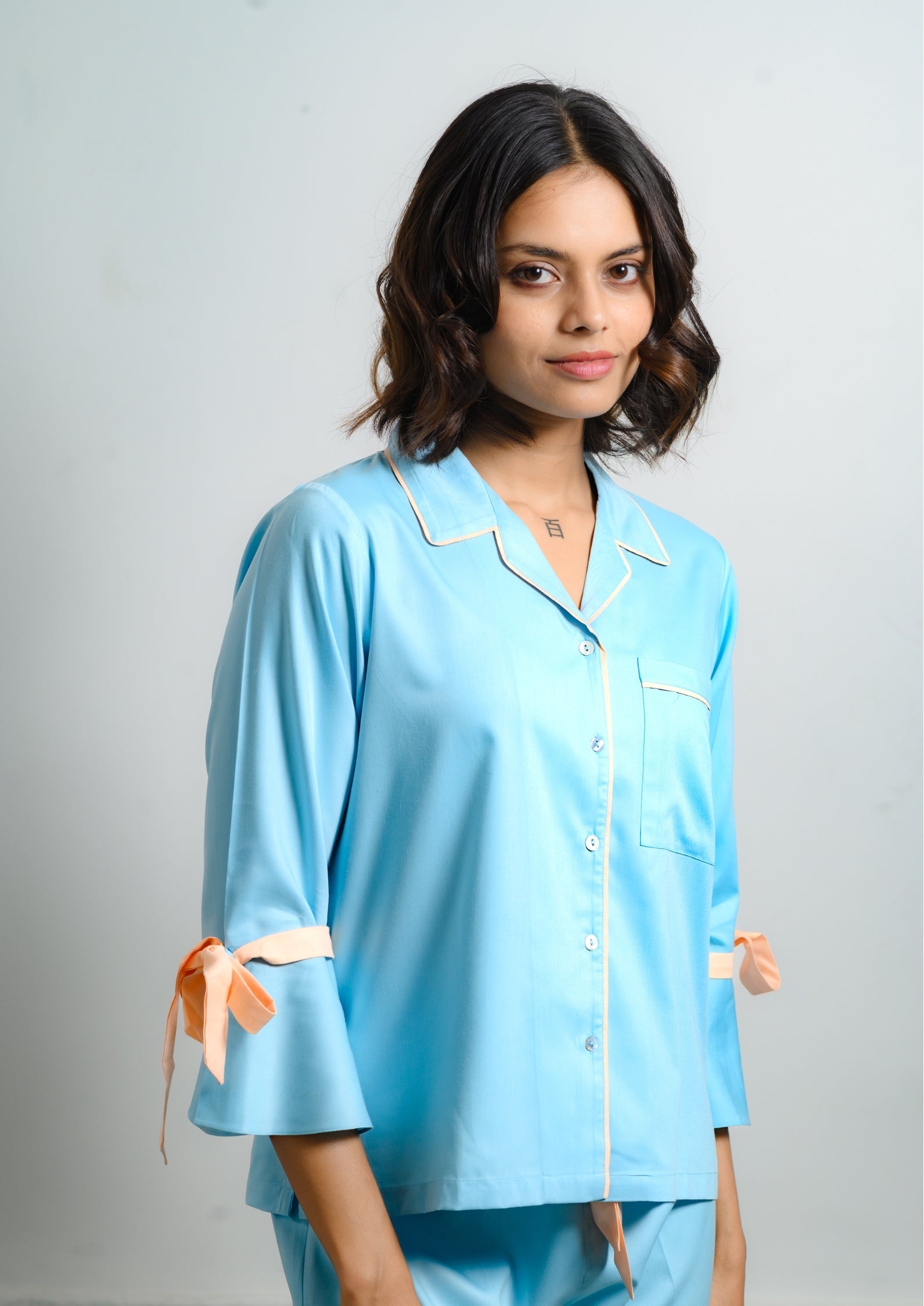 Slip into effortless elegance with the Sky Blue Satin Bow-Tie Shorts Set — a chic fusion of comfort, luxury, and feminine charm. Crafted from premium satin with a soft sheen, this stylish ensemble brings a touch of sophistication to your lounge or nightwear collection.
