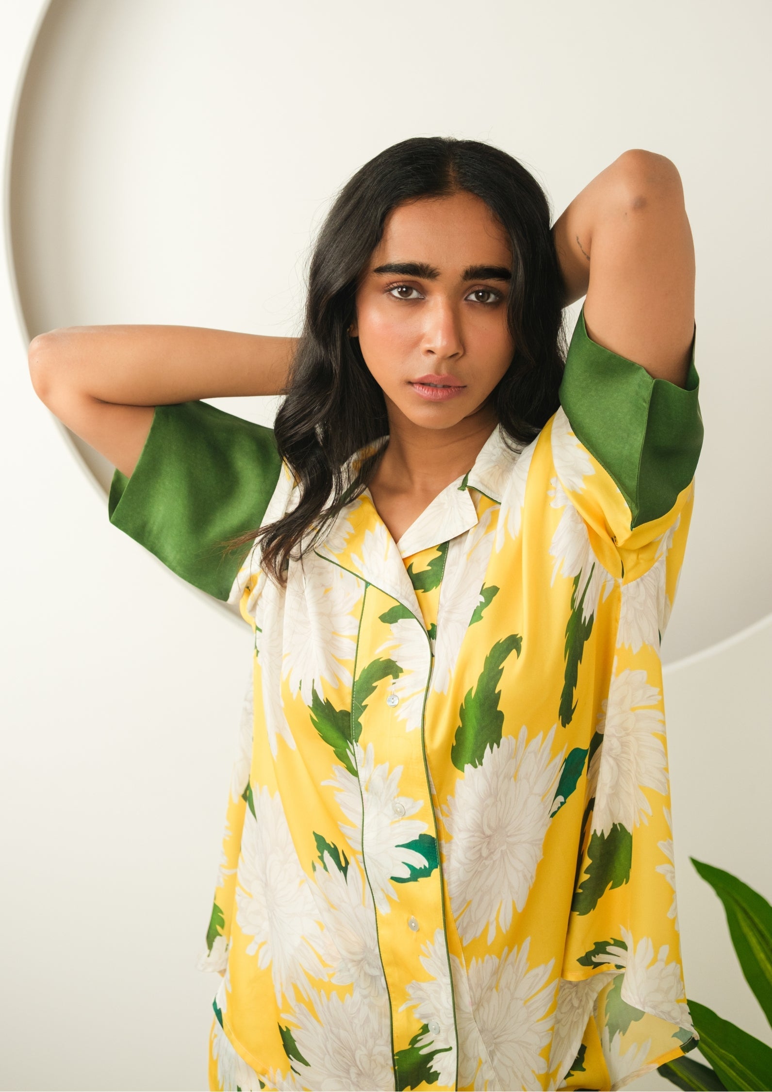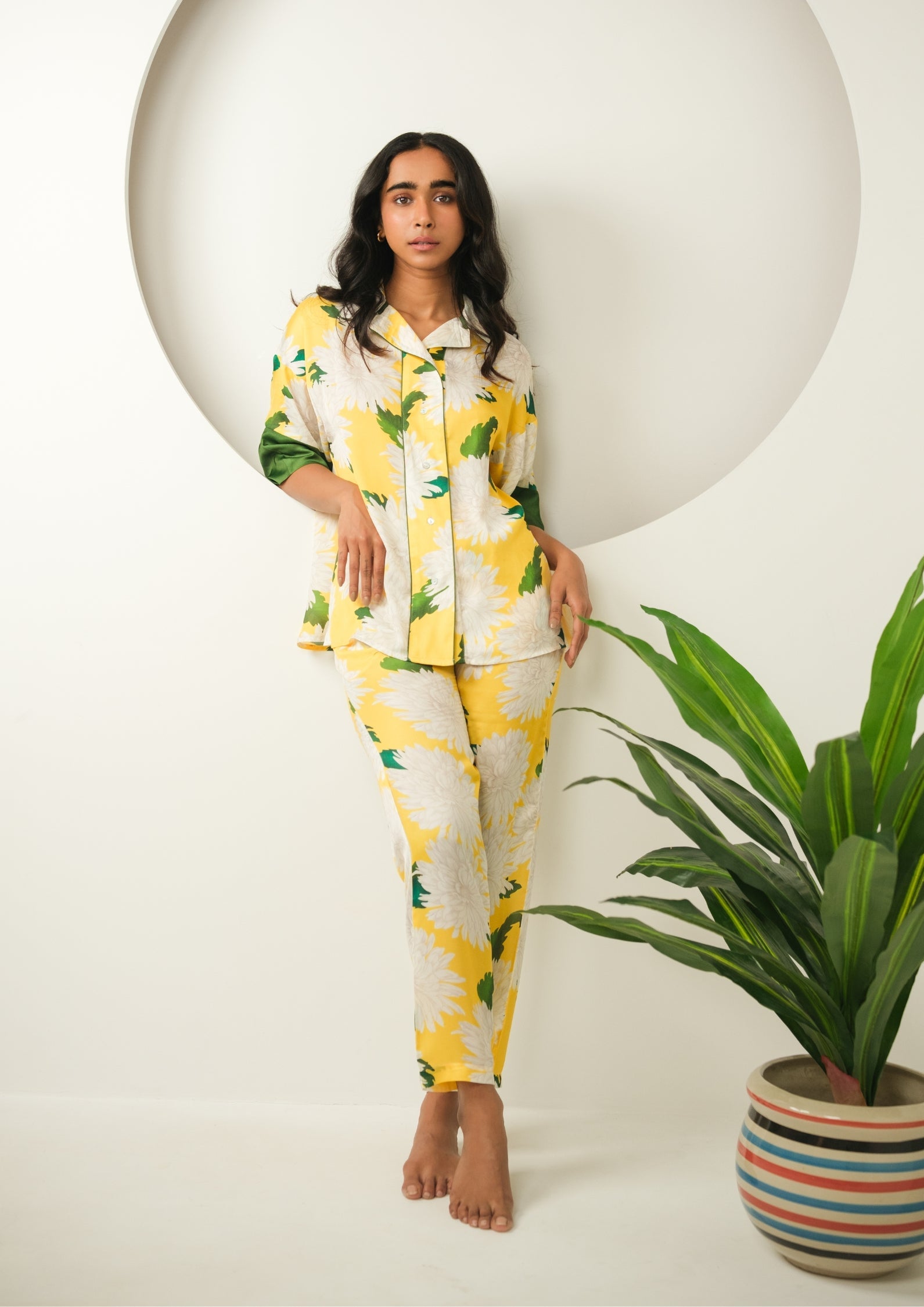 Brighten your evenings and mornings with the Sunlit Bloom Printed Night Suit. Designed in a radiant yellow base adorned with oversized florals, this set effortlessly balances comfort and style. The button-down shirt paired with easy-fit trousers makes it ideal for lounging, working from home, or cozying up for a restful sleep. Soft on the skin and bold in design, it’s your go-to for everyday elegance.