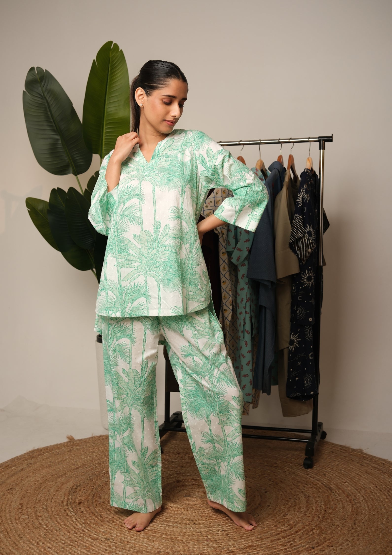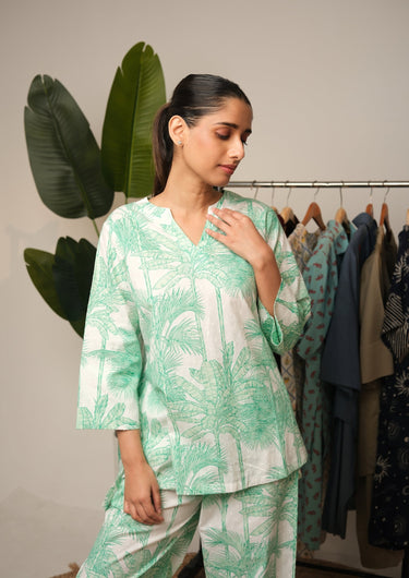 Step into effortless elegance with the Tropical Palm Printed Co-Ord Set — a refreshing ensemble that blends comfort with contemporary style. Crafted from premium breathable fabric, this set features soothing green palm leaf prints that evoke the calm of a tropical escape. Perfect for lounging, travel, or casual days out, it’s your go-to for chic, easy dressing.