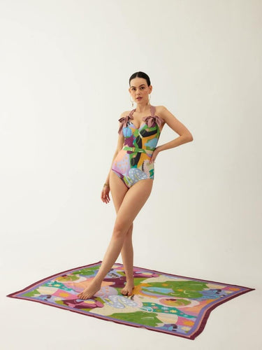 Serene gets a dreamy upgrade in this printed push-up swimsuit with solid satin shoulder ties and a contrast belt finished with the signature Tizzi trim. Designed to turn heads while keeping coverage in check.