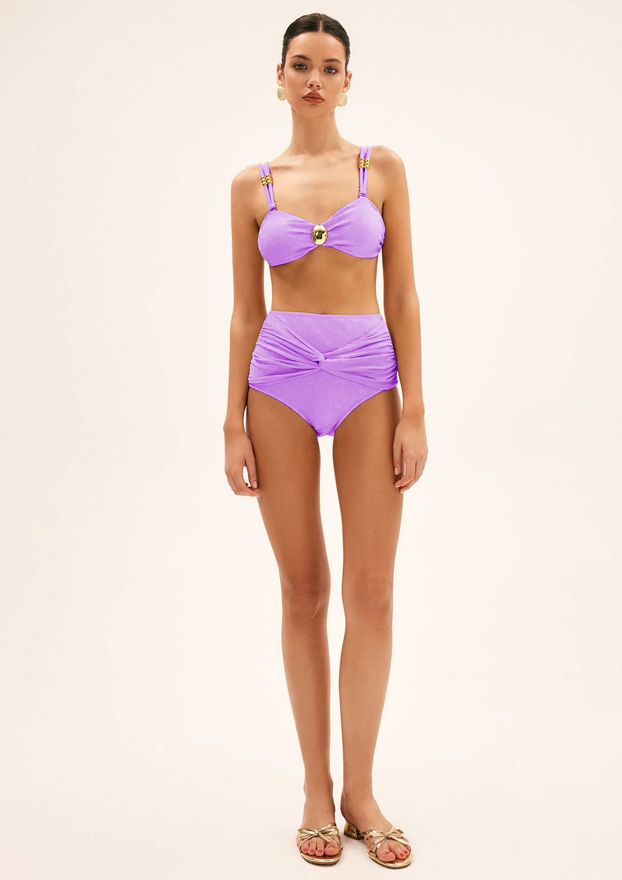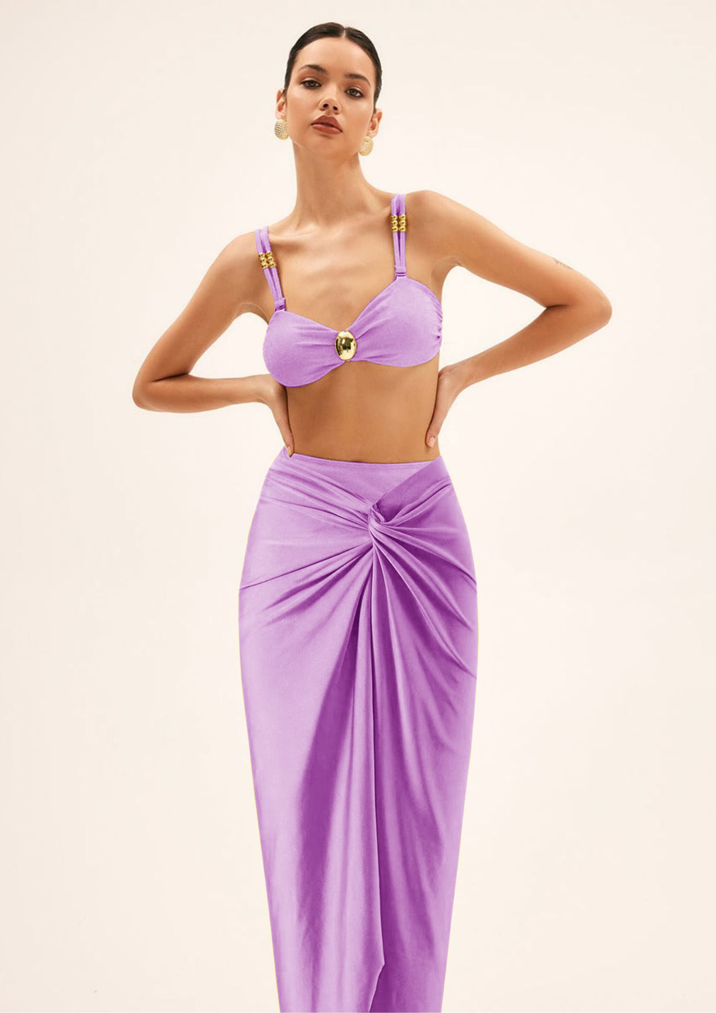 Chic, sweet, and effortlessly luxe — this lavender bikini and skirt set is made for sun-drenched getaways. The high-waisted bottom gives sculpted coverage, while the textured bikini top adds structure and support with gold hardware and double straps.