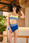 A classic 2-piece bikini set with color block patterns. The high-waist bottoms make them comfortable to swim around while broad shoulder straps provide the much-needed shoulder support for active water activities.