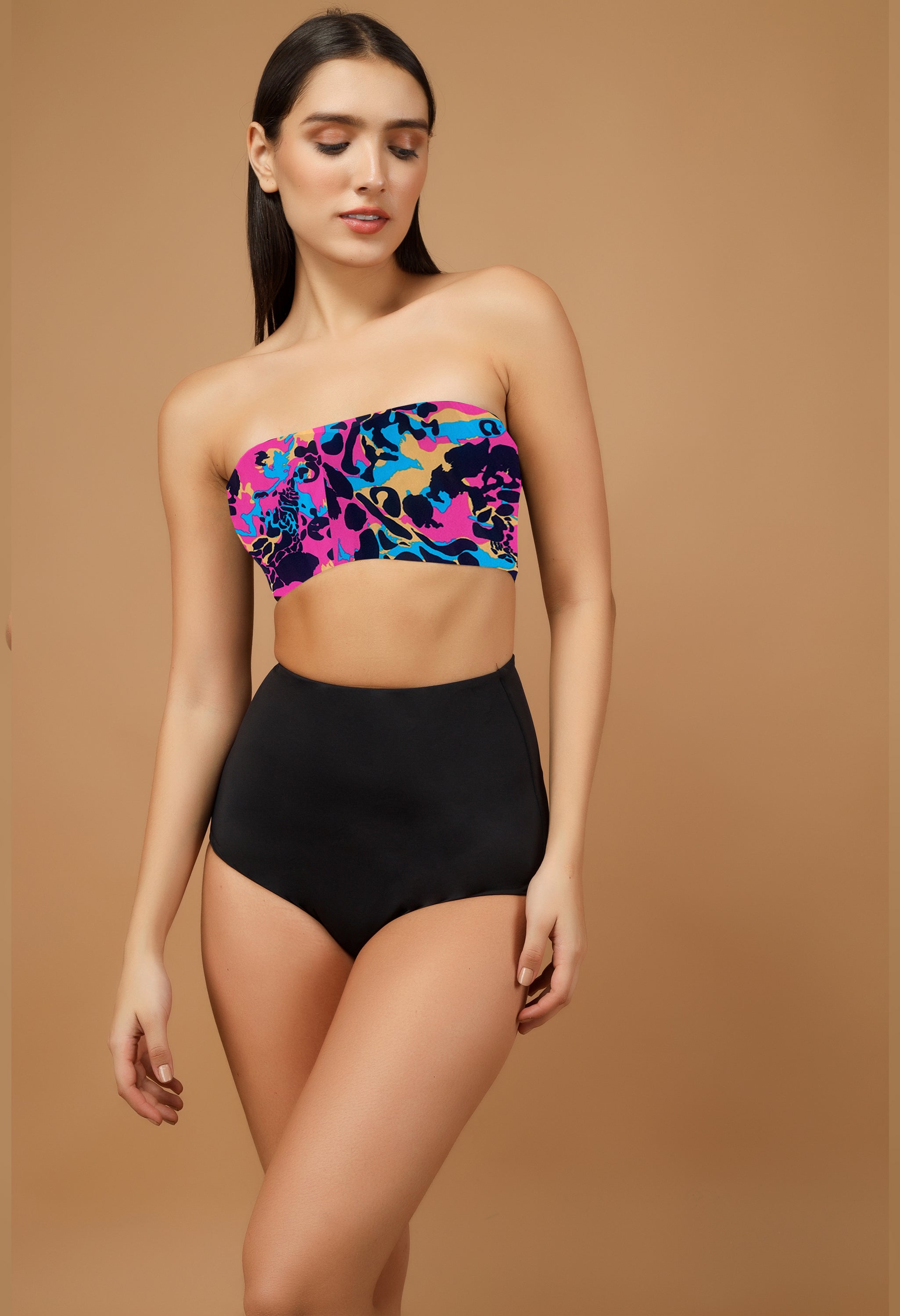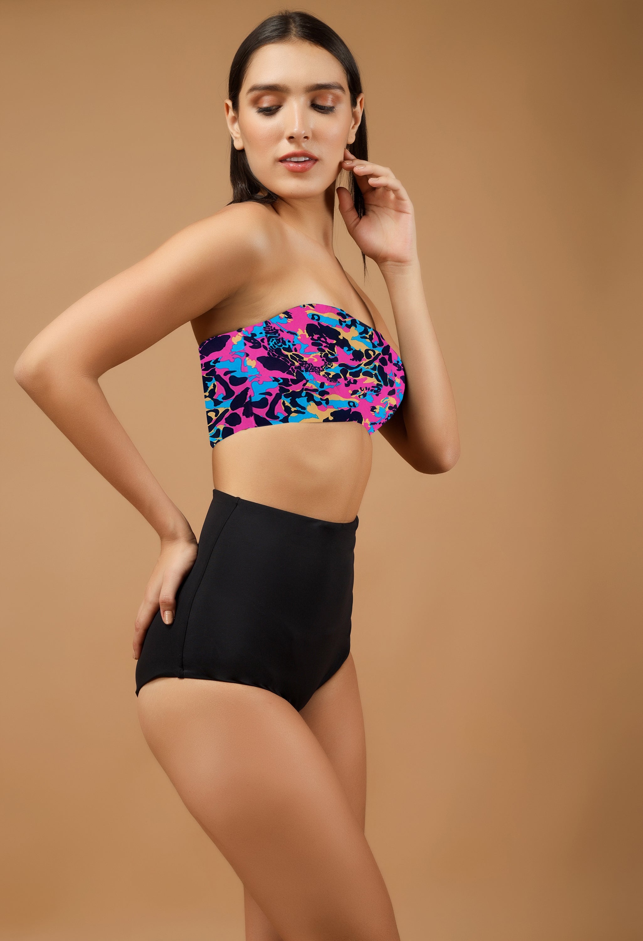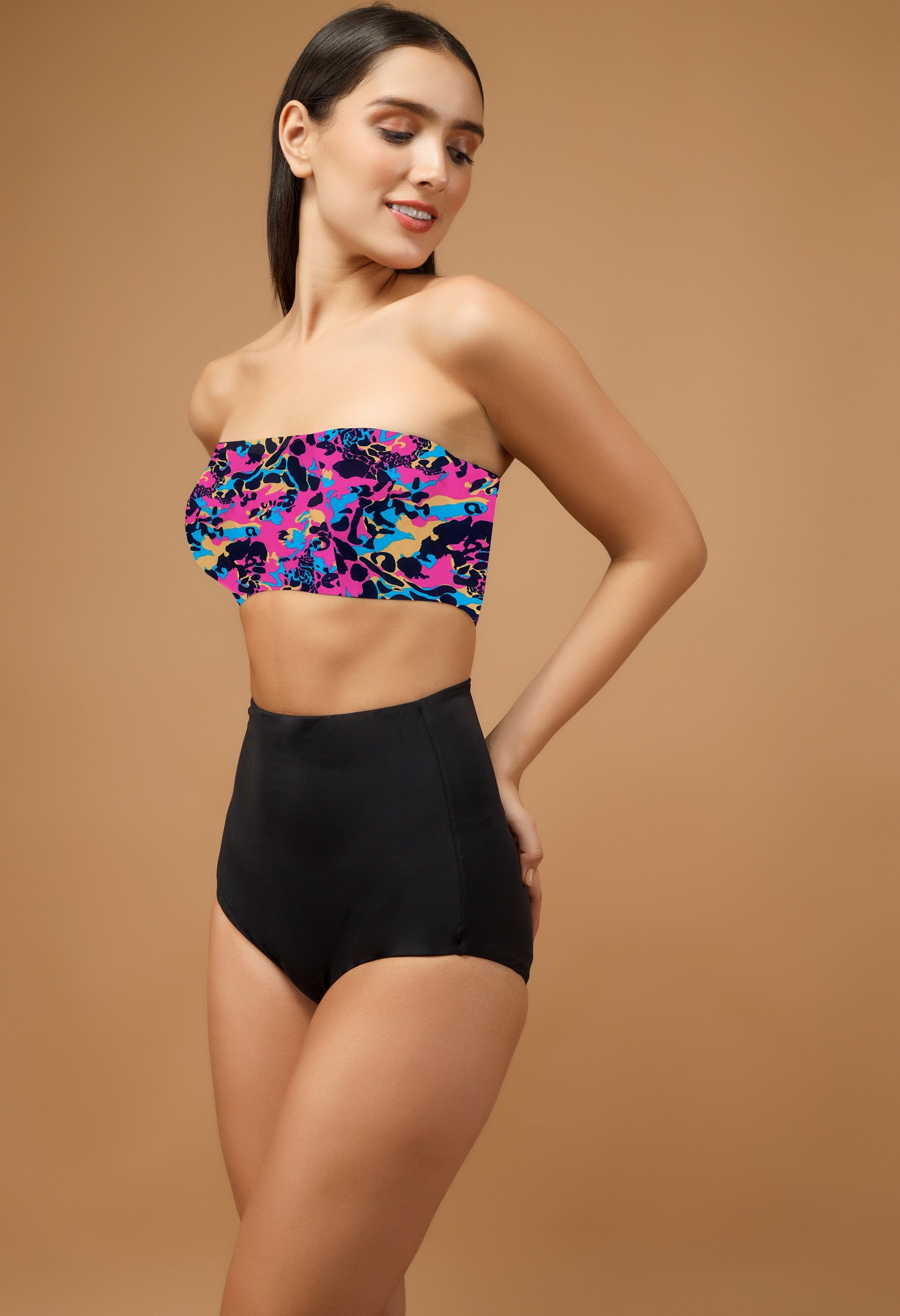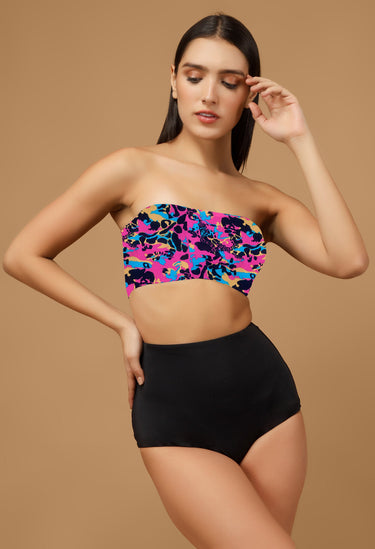 A vibrant pink tropical print two-piece swimsuit thats fun, flattering, and made for your next getaway. With a playful bandeau top and chic cutwork side detailing on the briefs, this set is all about confident vacation style.