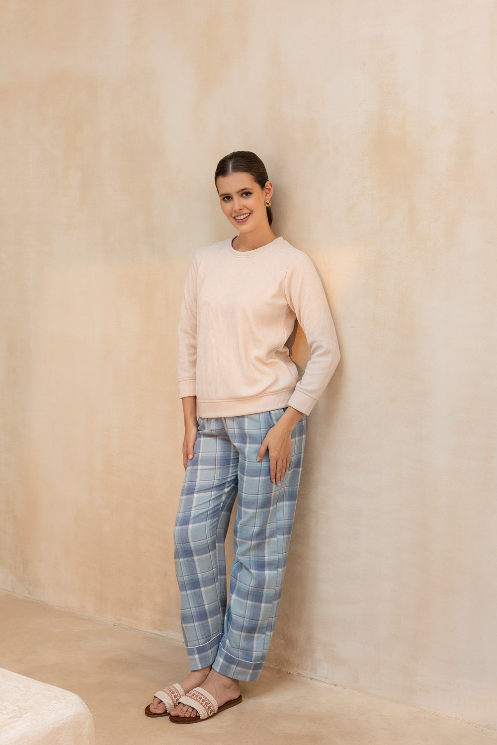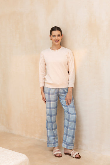 Stay warm and stylish with our Check Flannel Pajama & Velvet Sweatshirt Set. The soft, classic check flannel pajamas pair perfectly with the plush velvet sweatshirt, offering ultimate comfort and a chic look for relaxing at home or cozy winter nights.