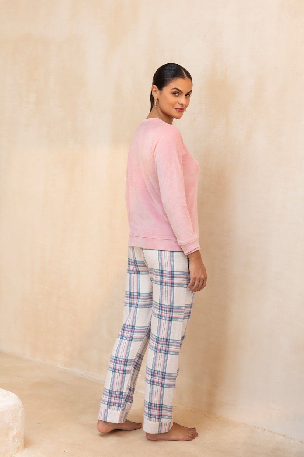 Stay warm and stylish with our Check Flannel Pajama & Velvet Sweatshirt Set. The soft, classic check flannel pajamas pair perfectly with the plush velvet sweatshirt, offering ultimate comfort and a chic look for relaxing at home or cozy winter nights.