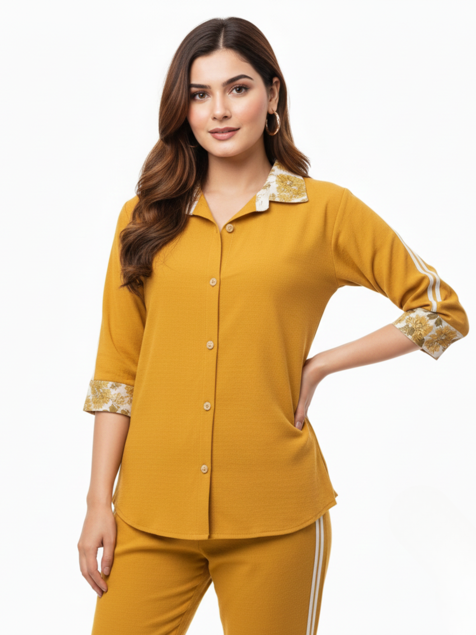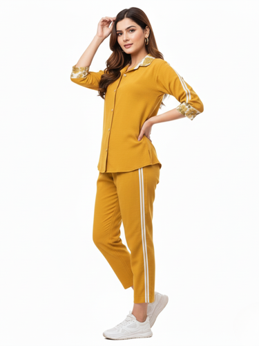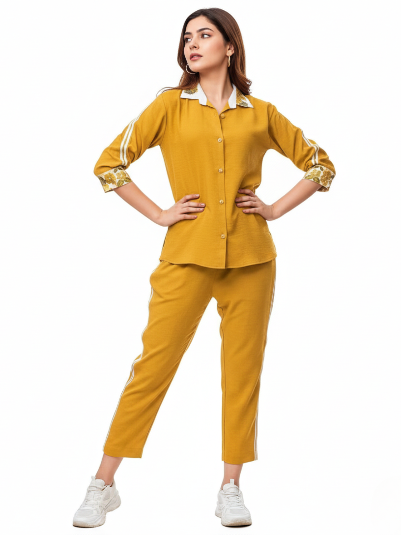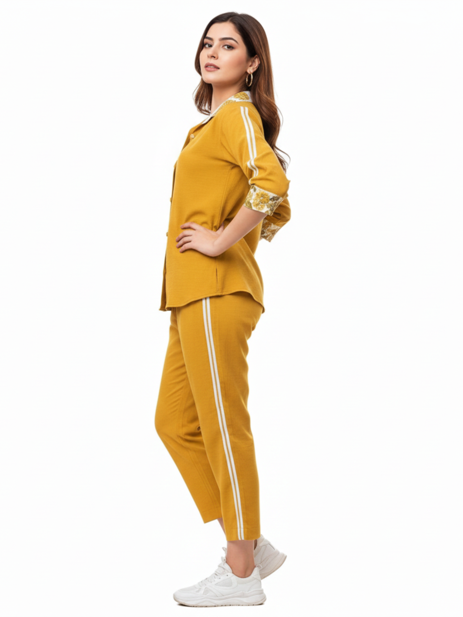 From the Brand Melodie, Curated by Covera. This striking mustard linen co-ord set blends sporty sophistication with comfort, featuring contrasting white trim and delicate embroidery for a fresh take on contemporary loungewear.