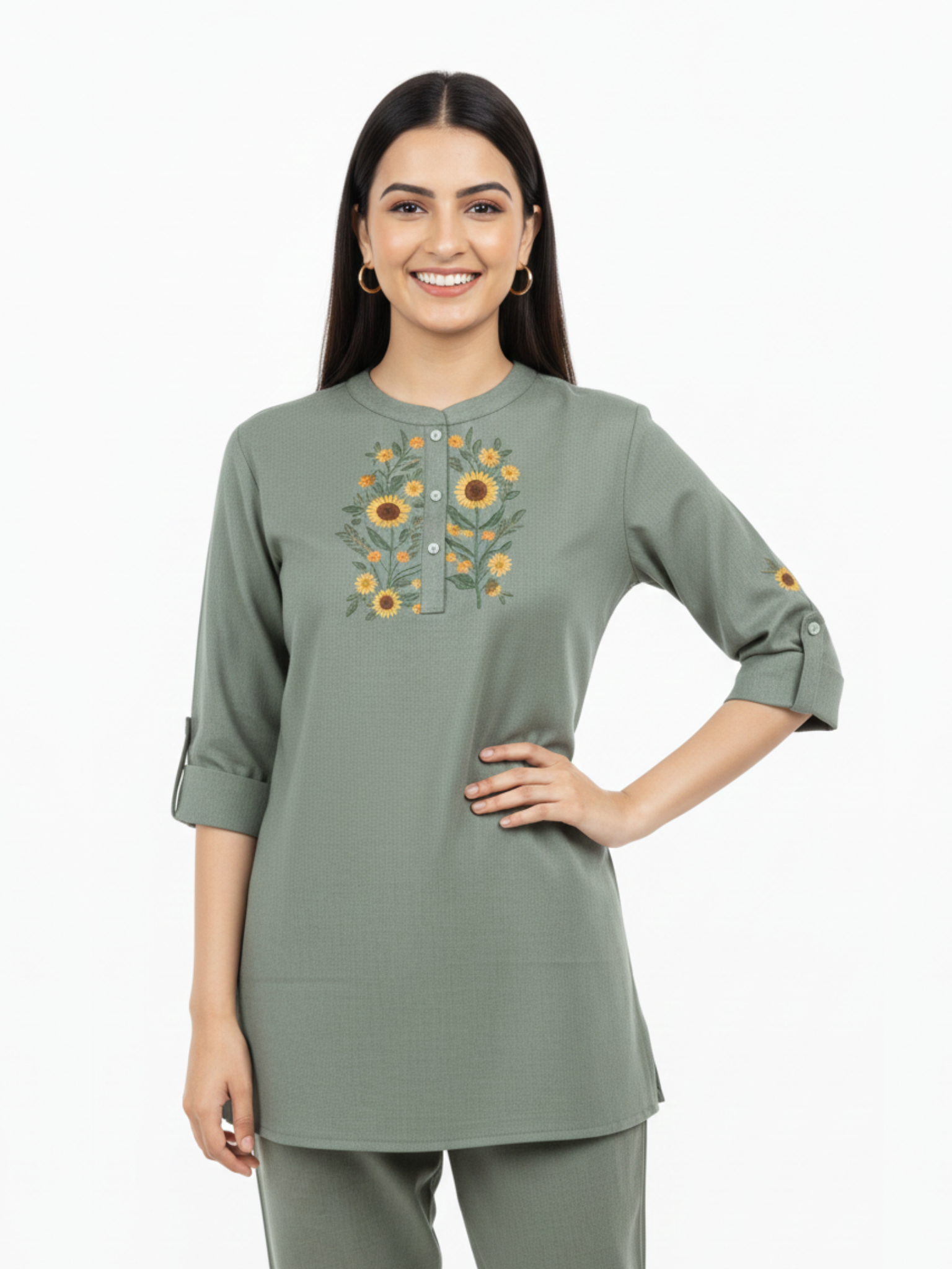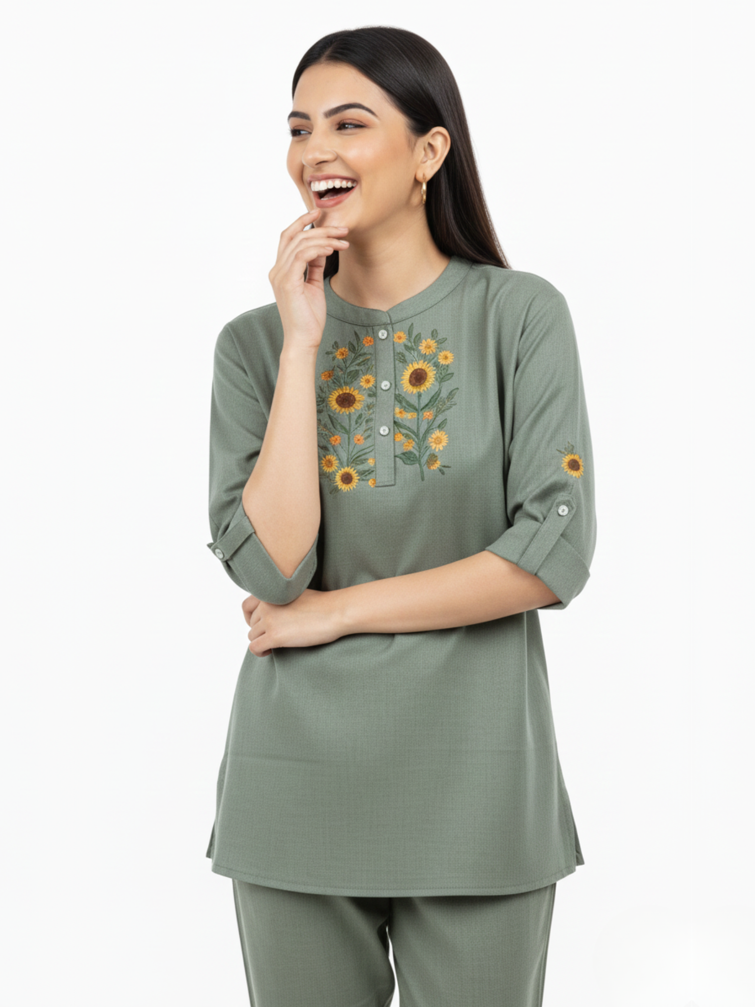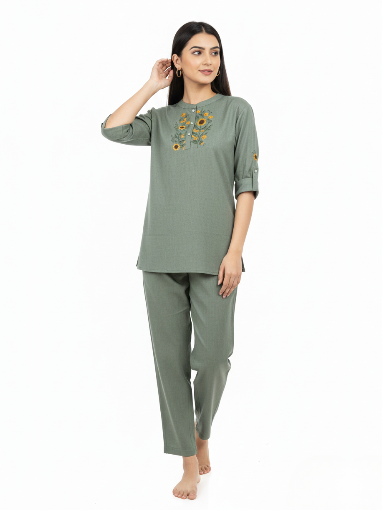 From the Brand Melodie, Curated by Covera. This soothing sage green cotton co-ord set showcases cheerful sunflower embroidery and practical design details, a loungewear choice that balances comfort with thoughtful styling.