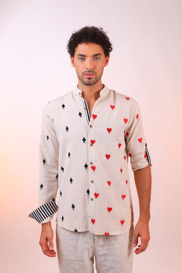 A festive favourite with a playful twist, the Spade of Hearts shirt is embroidered with an intricate mix of spade and heart motifs. Crafted from soft, breathable cotton in a relaxed fit with a mandarin collar, it’s designed to make an impression at Diwali parties, card nights, and celebratory gatherings.