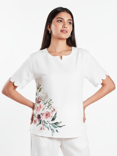 - Notched round neckline top with short scalloped sleeves adds subtle feminine detailing to the relaxed silhouette